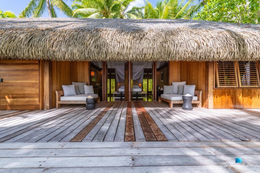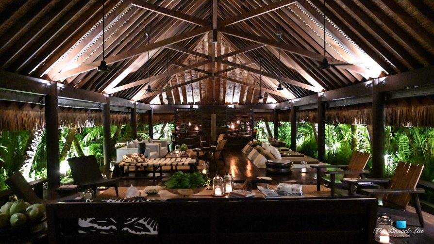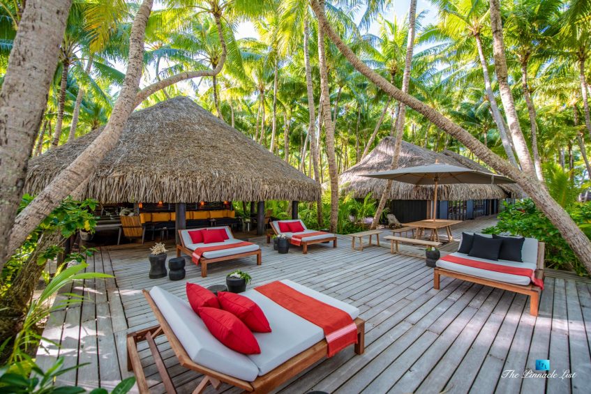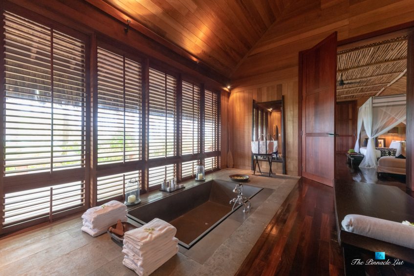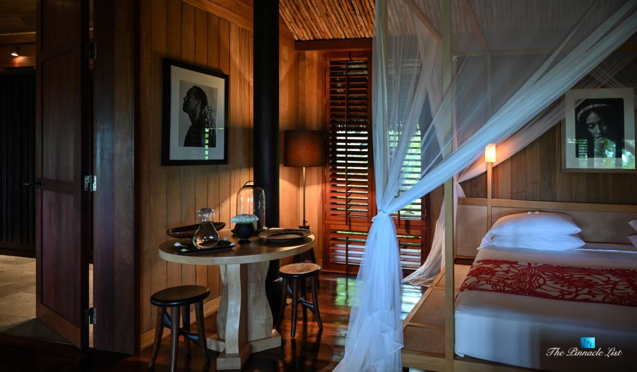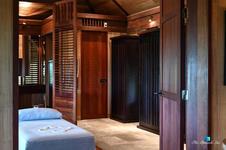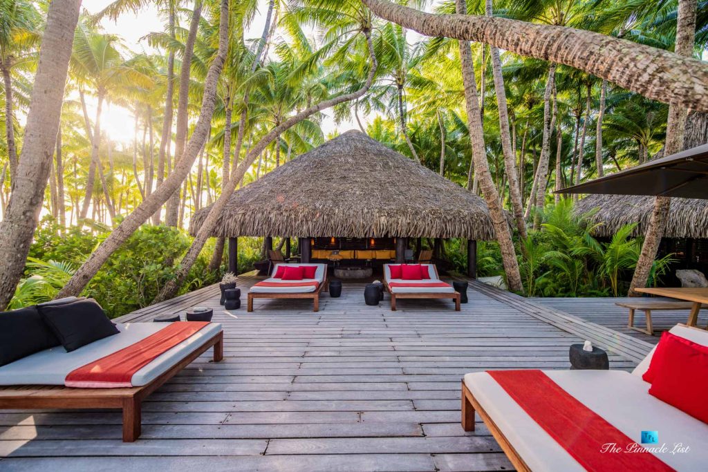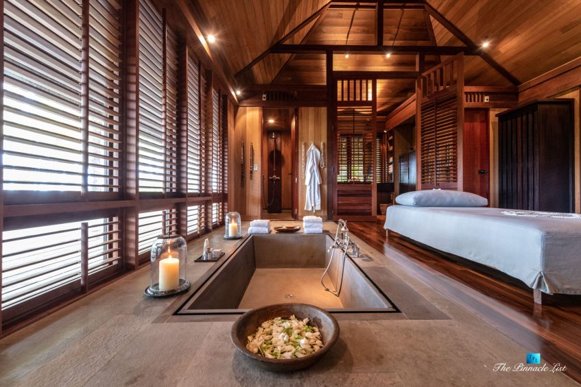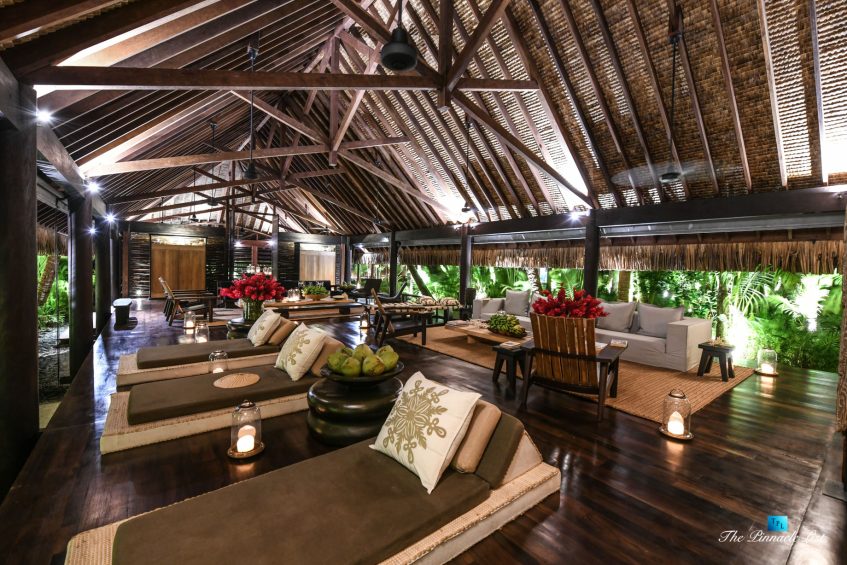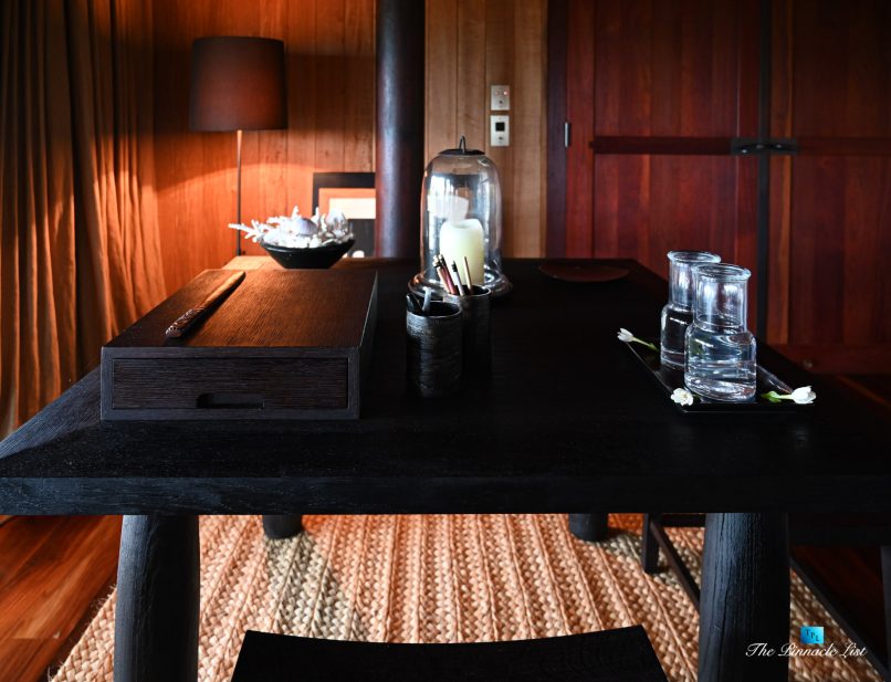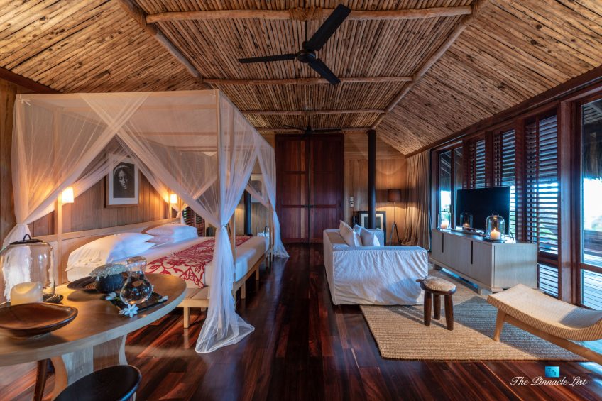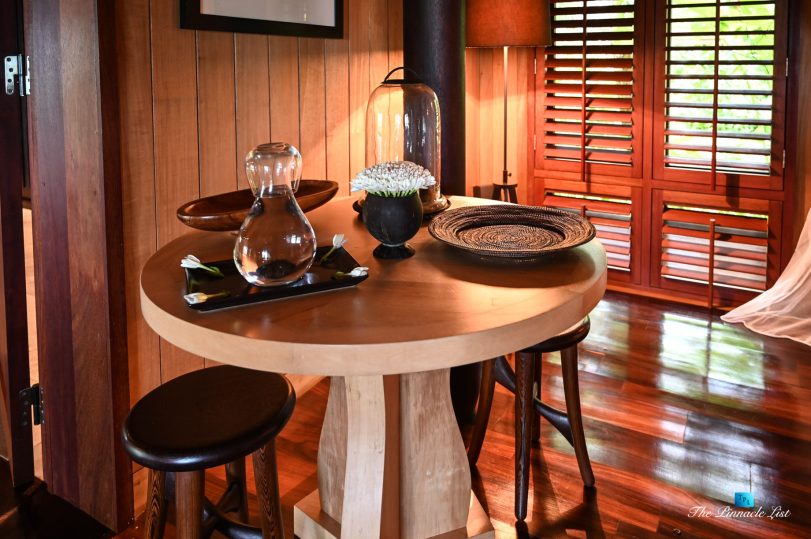The grand room, an expansive space designed for both elegant gatherings and intimate soirées, is accompanied by a dining area equipped with a discreet wet bar and two large, custom-made tables capable of welcoming up to 36 guests in a setting of unparalleled grace and sophistication. Designed by the world-renowned Christian Liaigre, the interiors are a symphony of exclusive craftsmanship, with furniture custom-made from rare tropical woods and natural fabrics, enhancing the connection between luxury and the serenity of island life. Motorized screens in most bungalows offer the versatility to merge indoor opulence with the natural allure of the outdoors, providing a unique shelter against the elements when necessary.