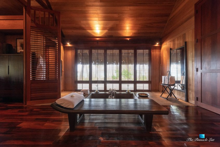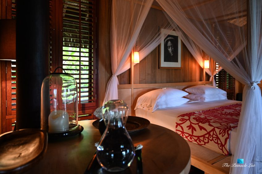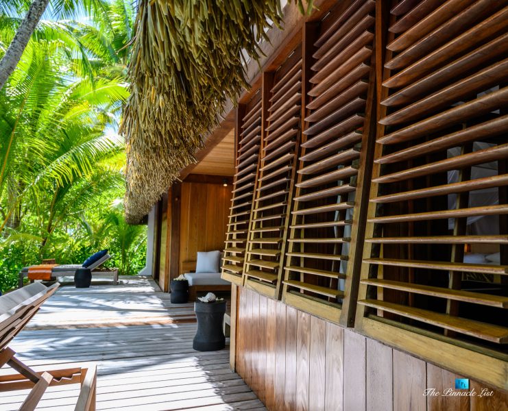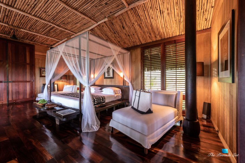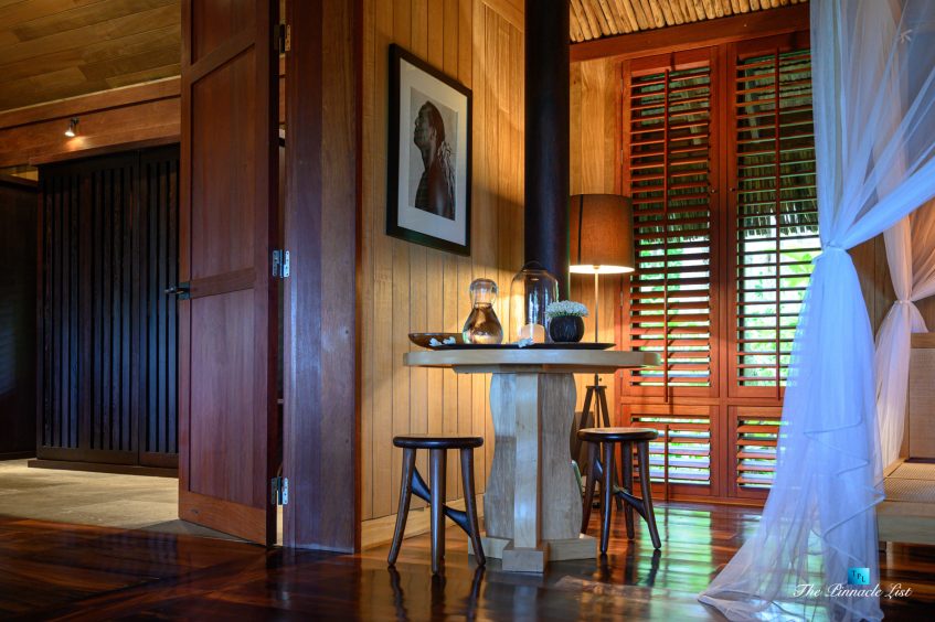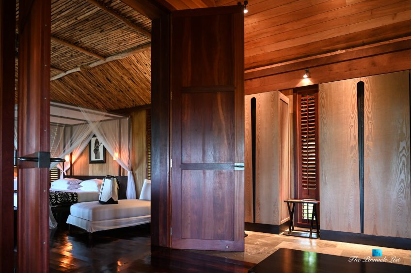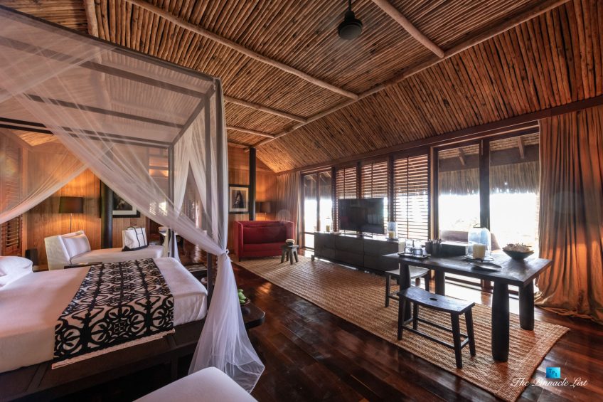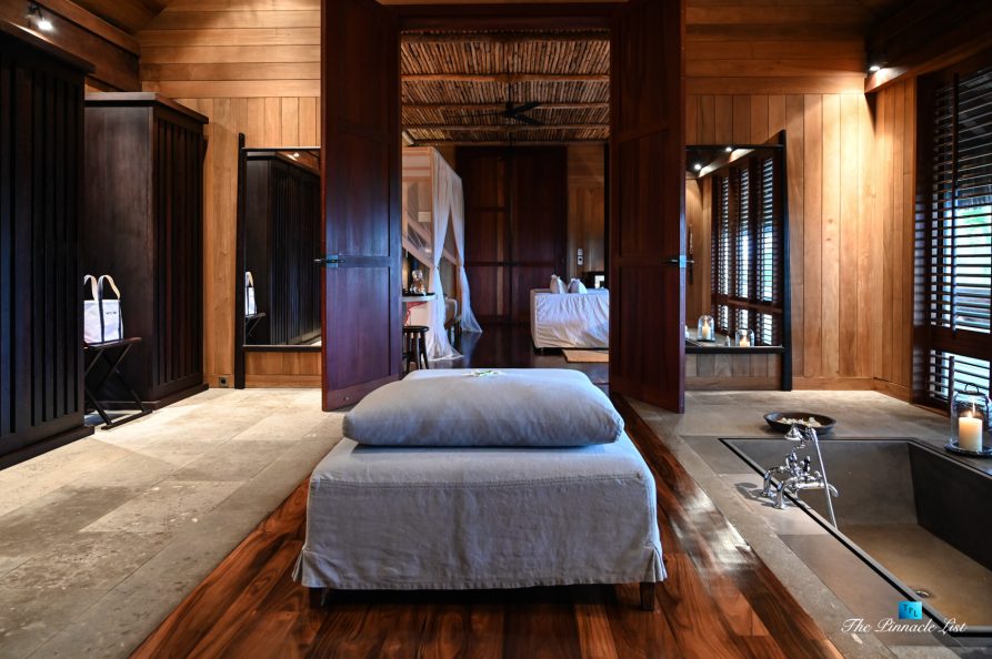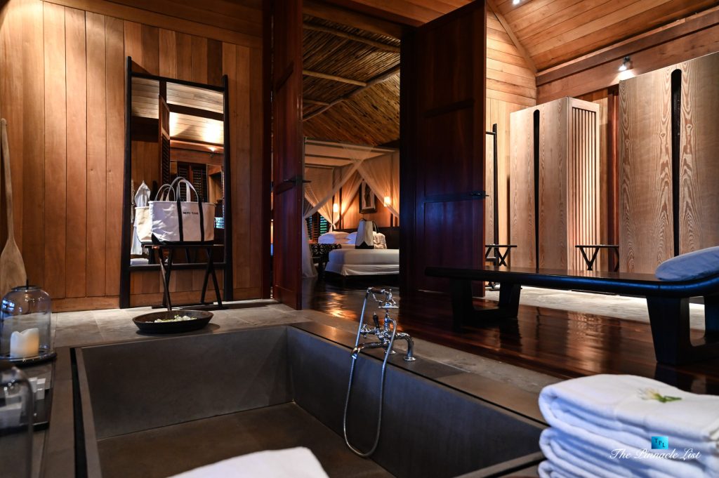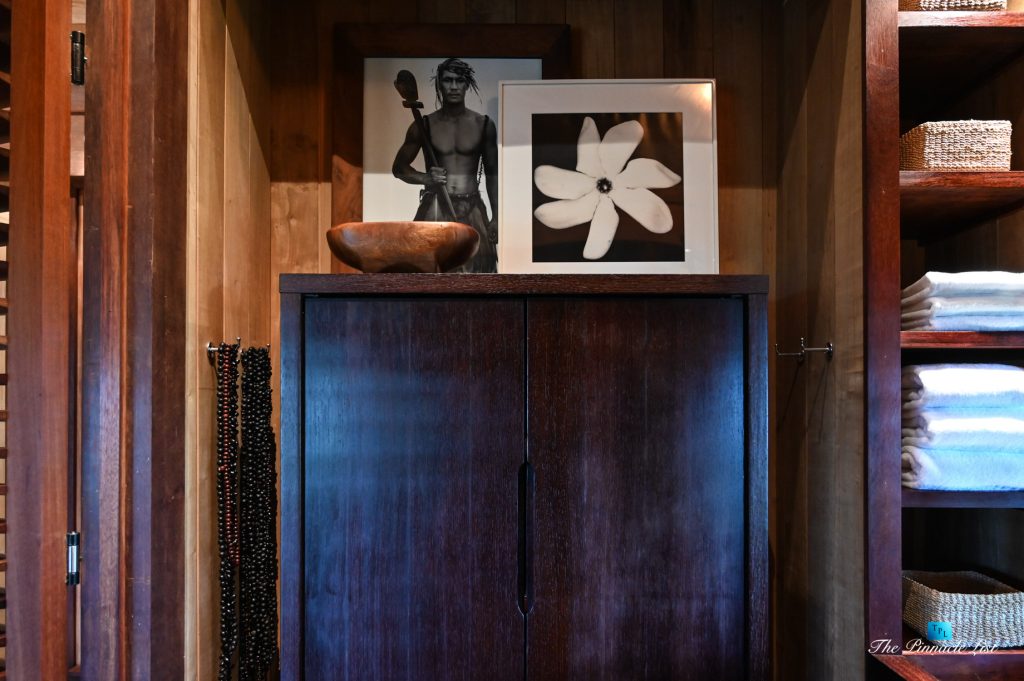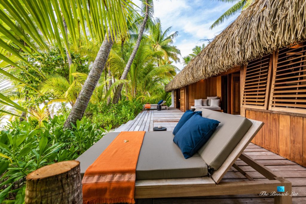 The grand room, an expansive space designed for both elegant gatherings and intimate soirées, is accompanied by a dining area equipped with a discreet wet bar and two large, custom-made tables capable of welcoming up to 36 guests in a setting of unparalleled grace and sophistication. Designed by the world-renowned Christian Liaigre, the interiors are a symphony of exclusive craftsmanship, with furniture custom-made from rare tropical woods and natural fabrics, enhancing the connection between luxury and the serenity of island life. Motorized screens in most bungalows offer the versatility to merge indoor opulence with the natural allure of the outdoors, providing a unique shelter against the elements when necessary.