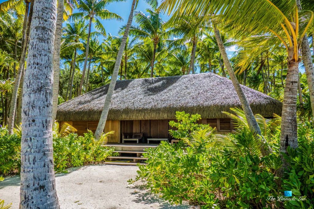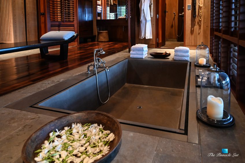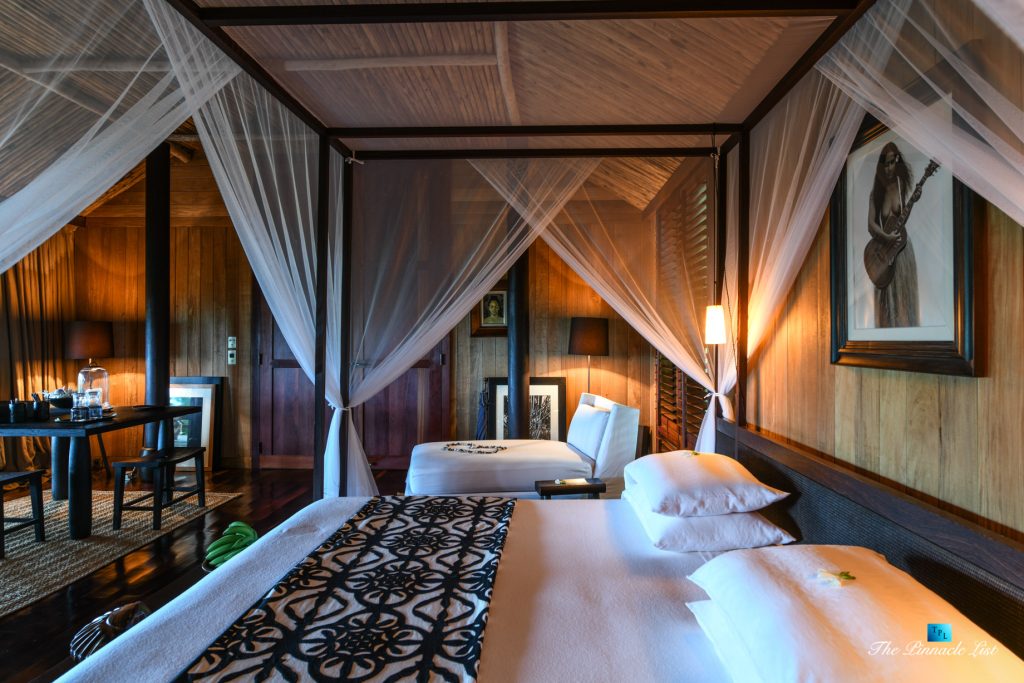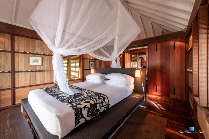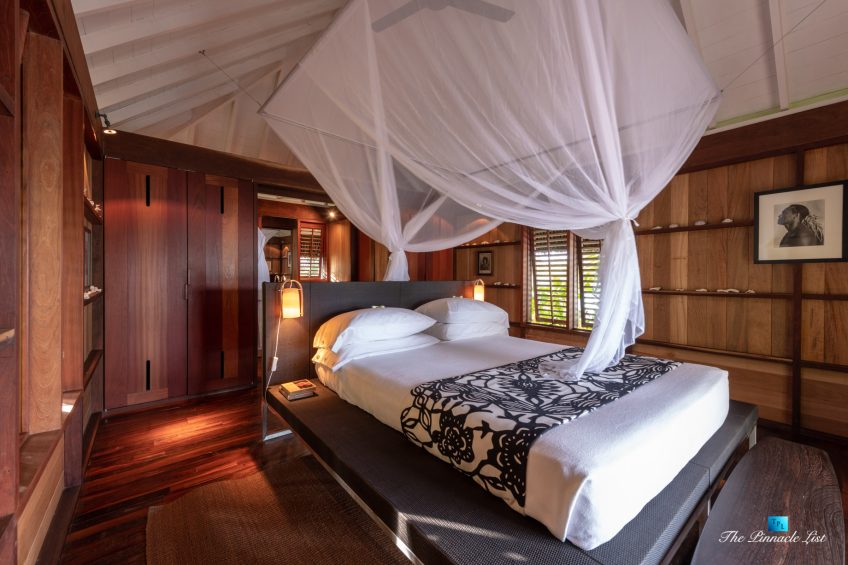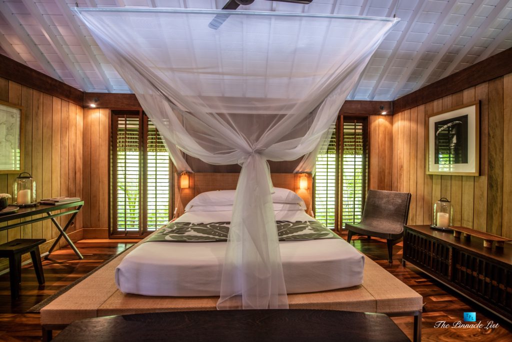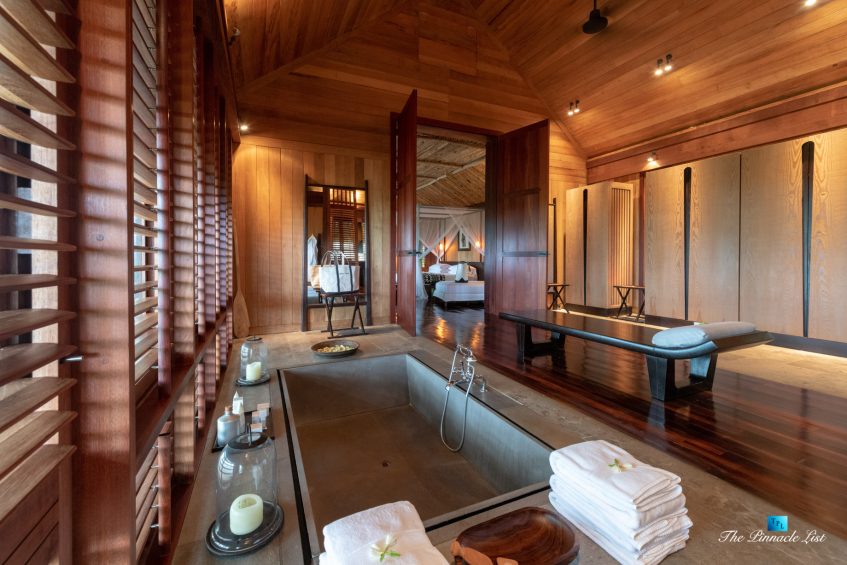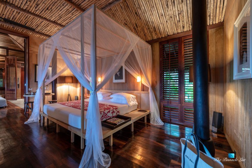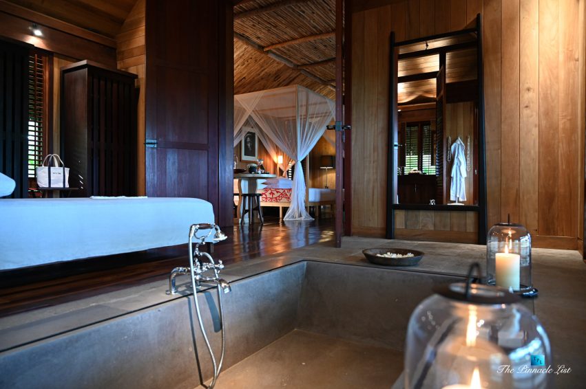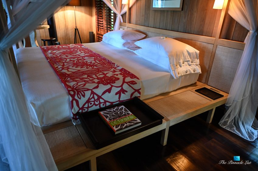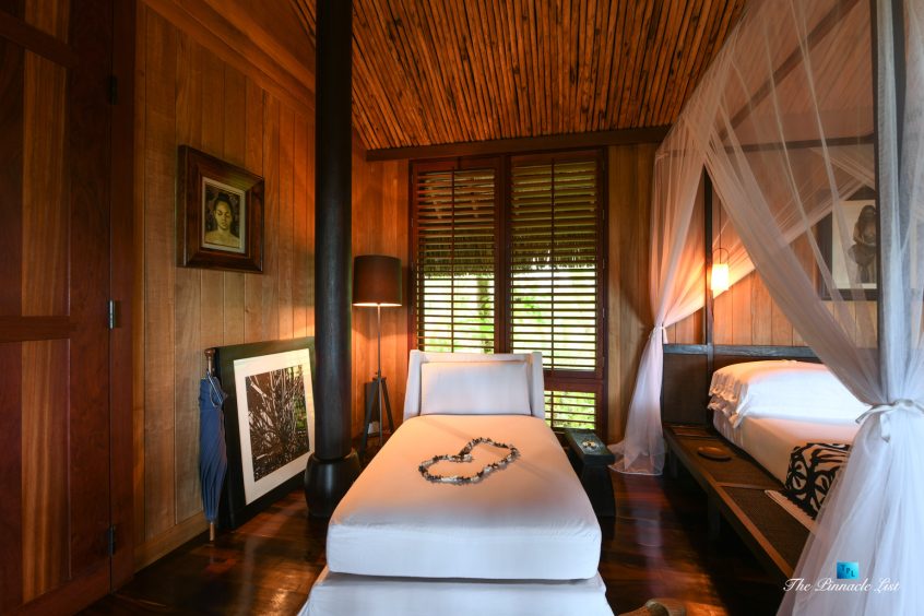 The grand room, an expansive space designed for both elegant gatherings and intimate soirées, is accompanied by a dining area equipped with a discreet wet bar and two large, custom-made tables capable of welcoming up to 36 guests in a setting of unparalleled grace and sophistication. Designed by the world-renowned Christian Liaigre, the interiors are a symphony of exclusive craftsmanship, with furniture custom-made from rare tropical woods and natural fabrics, enhancing the connection between luxury and the serenity of island life. Motorized screens in most bungalows offer the versatility to merge indoor opulence with the natural allure of the outdoors, providing a unique shelter against the elements when necessary.