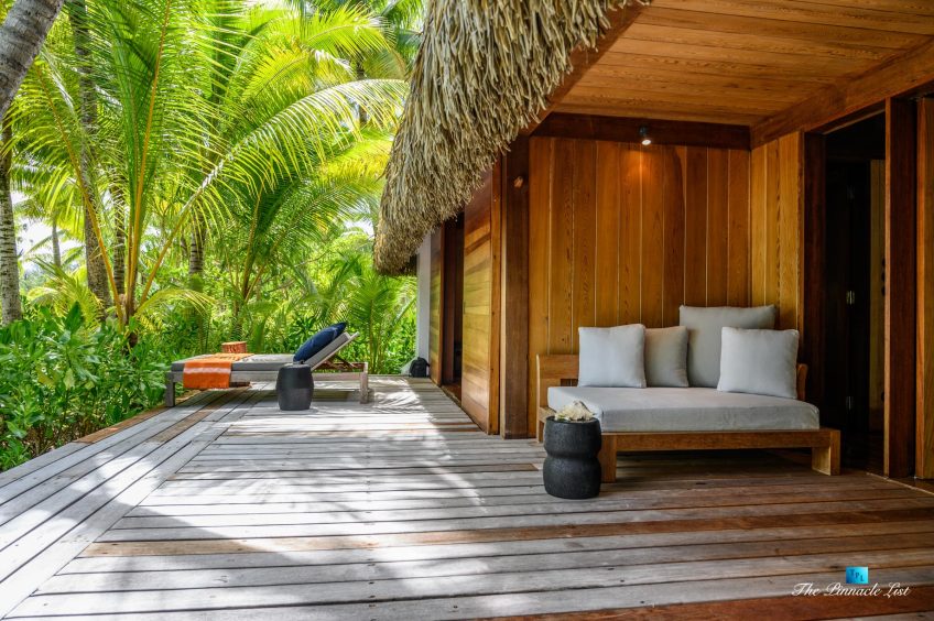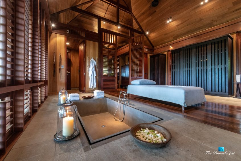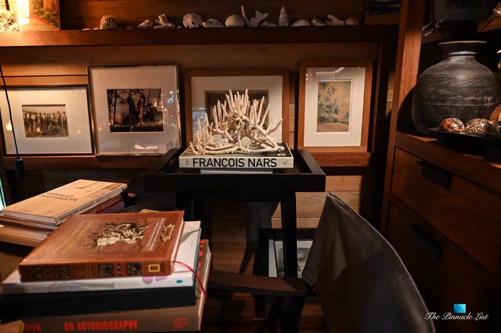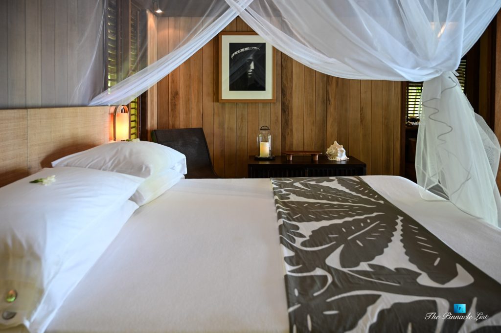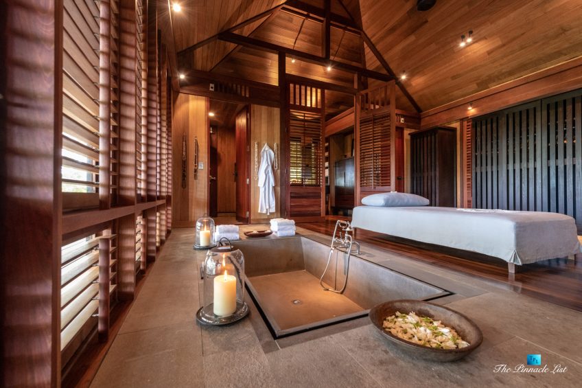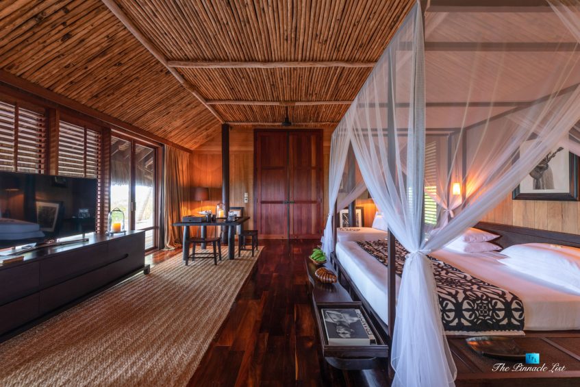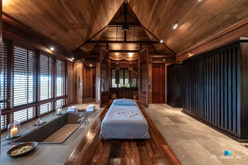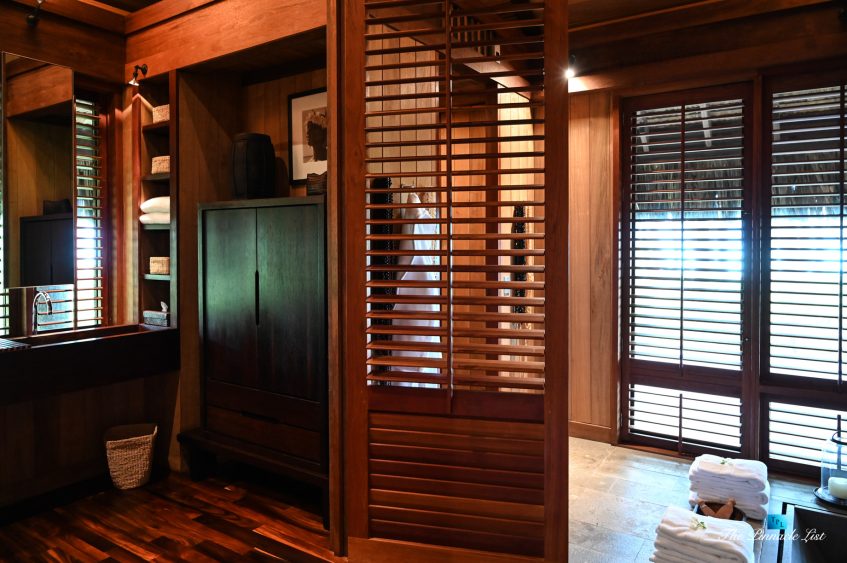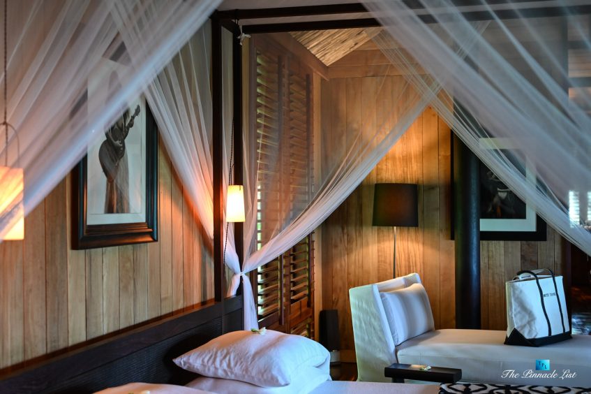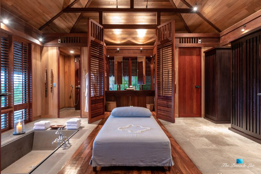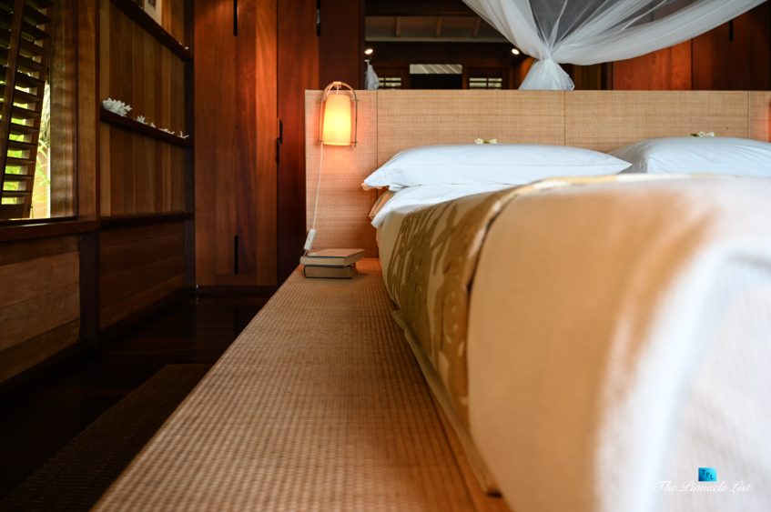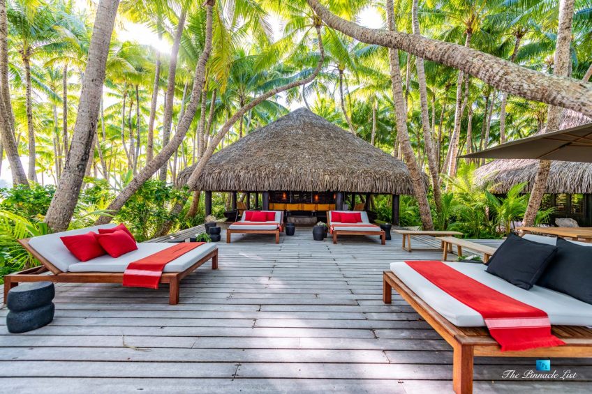The grand room, an expansive space designed for both elegant gatherings and intimate soirées, is accompanied by a dining area equipped with a discreet wet bar and two large, custom-made tables capable of welcoming up to 36 guests in a setting of unparalleled grace and sophistication. Designed by the world-renowned Christian Liaigre, the interiors are a symphony of exclusive craftsmanship, with furniture custom-made from rare tropical woods and natural fabrics, enhancing the connection between luxury and the serenity of island life. Motorized screens in most bungalows offer the versatility to merge indoor opulence with the natural allure of the outdoors, providing a unique shelter against the elements when necessary.