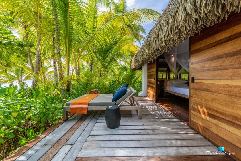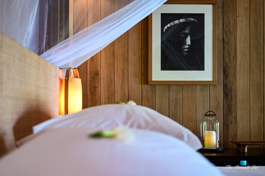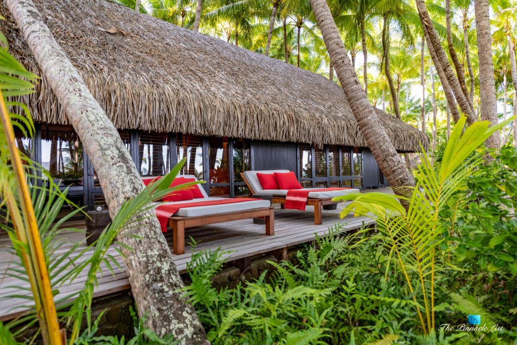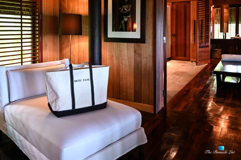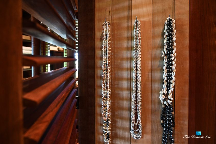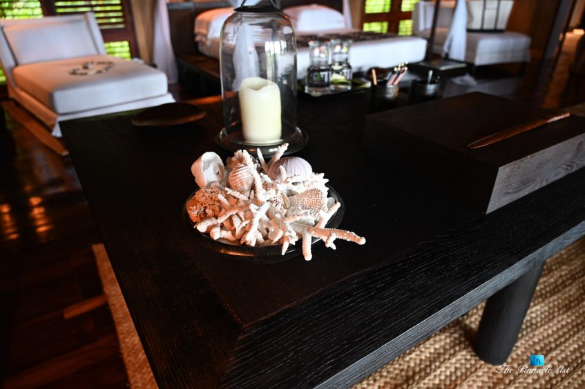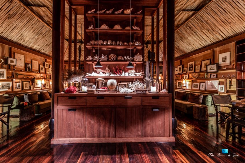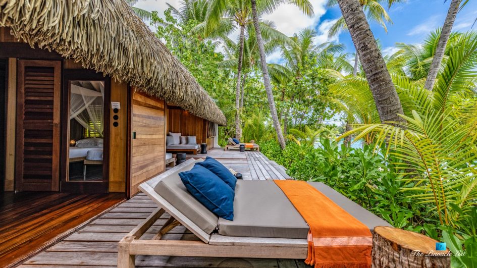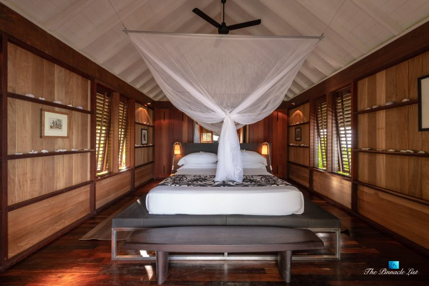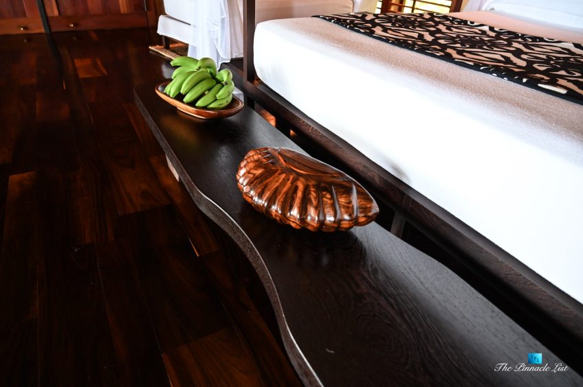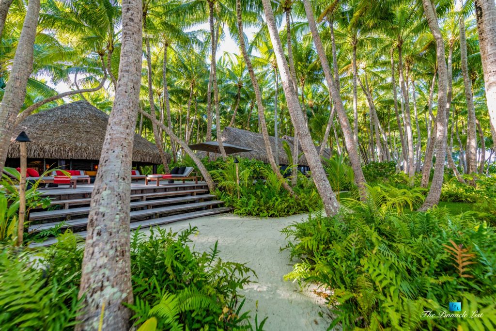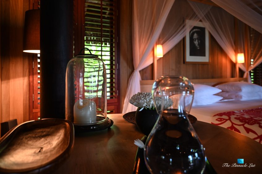 The grand room, an expansive space designed for both elegant gatherings and intimate soirées, is accompanied by a dining area equipped with a discreet wet bar and two large, custom-made tables capable of welcoming up to 36 guests in a setting of unparalleled grace and sophistication. Designed by the world-renowned Christian Liaigre, the interiors are a symphony of exclusive craftsmanship, with furniture custom-made from rare tropical woods and natural fabrics, enhancing the connection between luxury and the serenity of island life. Motorized screens in most bungalows offer the versatility to merge indoor opulence with the natural allure of the outdoors, providing a unique shelter against the elements when necessary.
