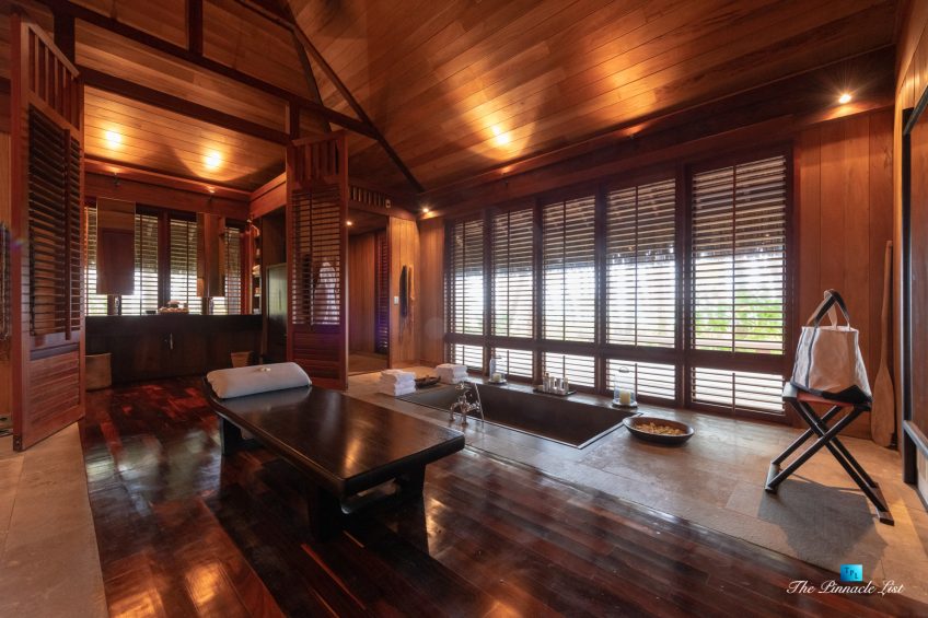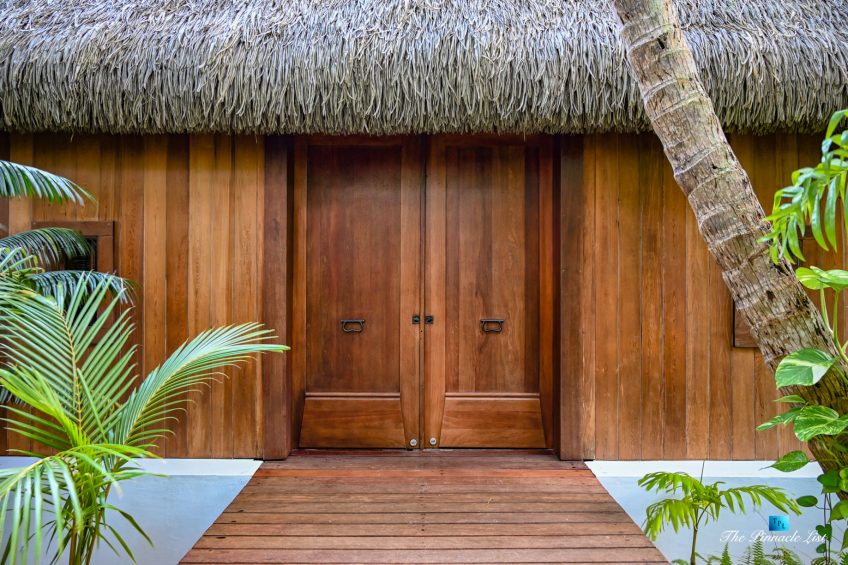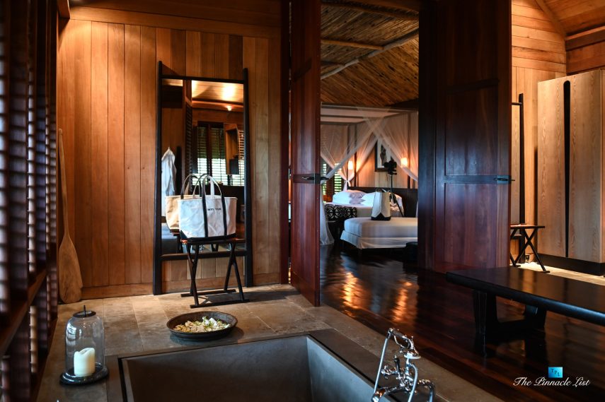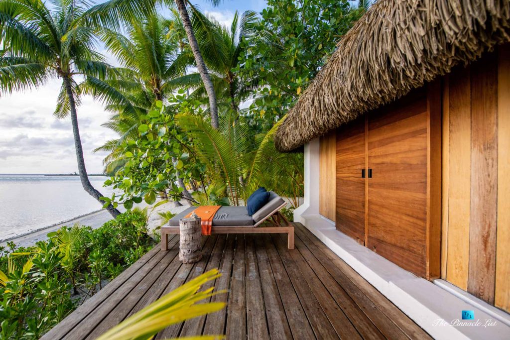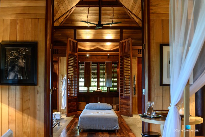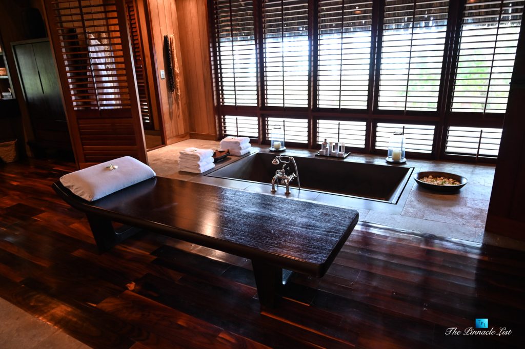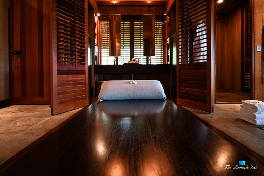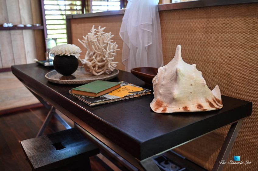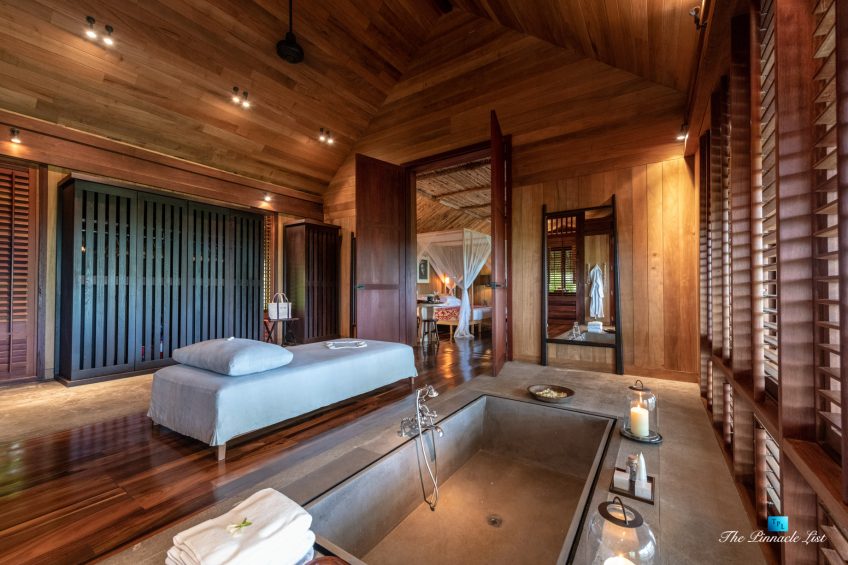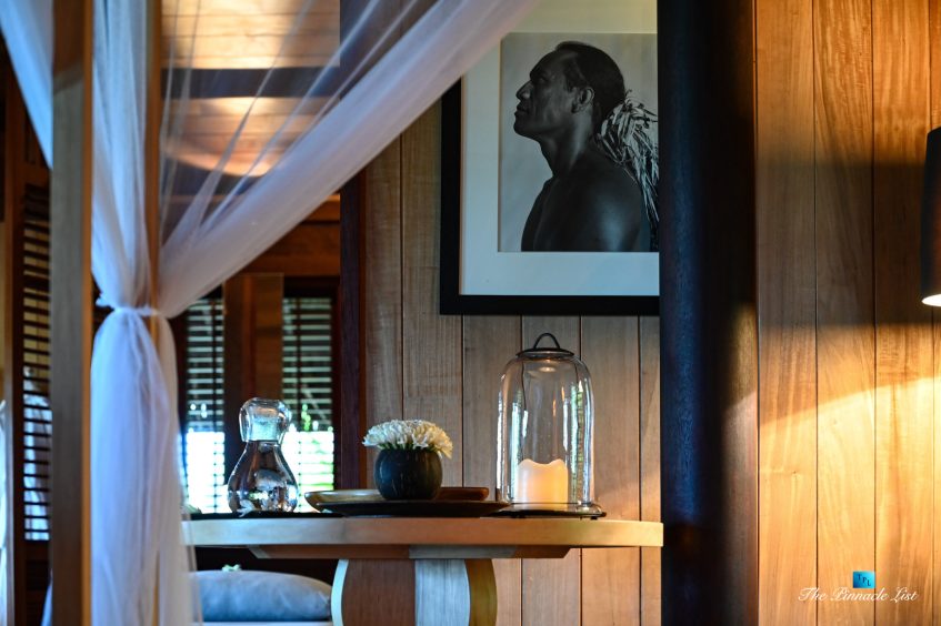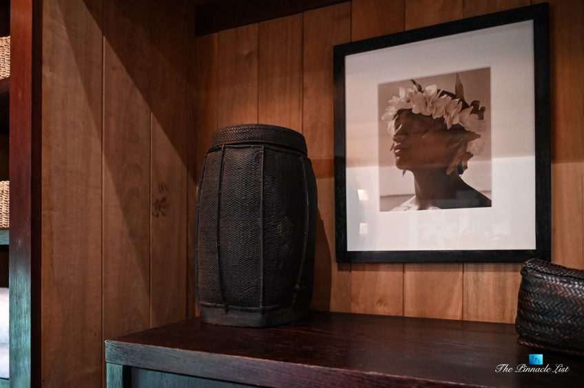 The grand room, an expansive space designed for both elegant gatherings and intimate soirées, is accompanied by a dining area equipped with a discreet wet bar and two large, custom-made tables capable of welcoming up to 36 guests in a setting of unparalleled grace and sophistication. Designed by the world-renowned Christian Liaigre, the interiors are a symphony of exclusive craftsmanship, with furniture custom-made from rare tropical woods and natural fabrics, enhancing the connection between luxury and the serenity of island life. Motorized screens in most bungalows offer the versatility to merge indoor opulence with the natural allure of the outdoors, providing a unique shelter against the elements when necessary.