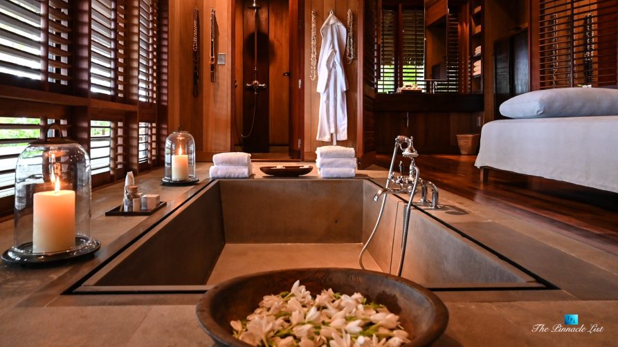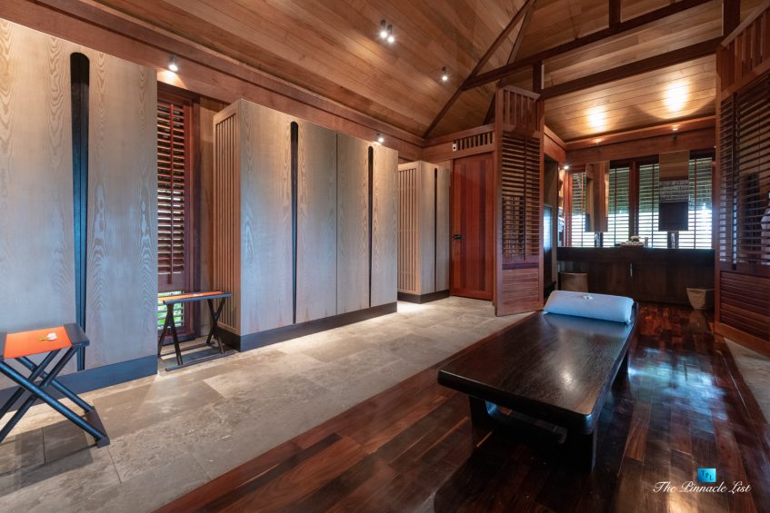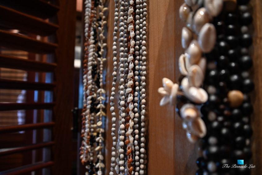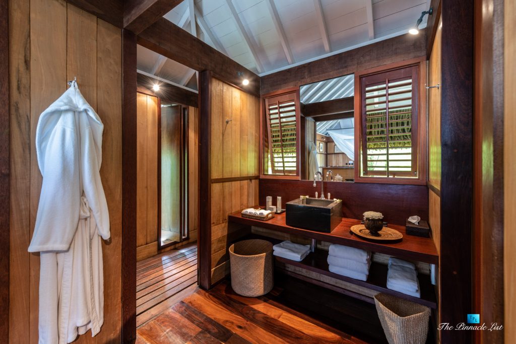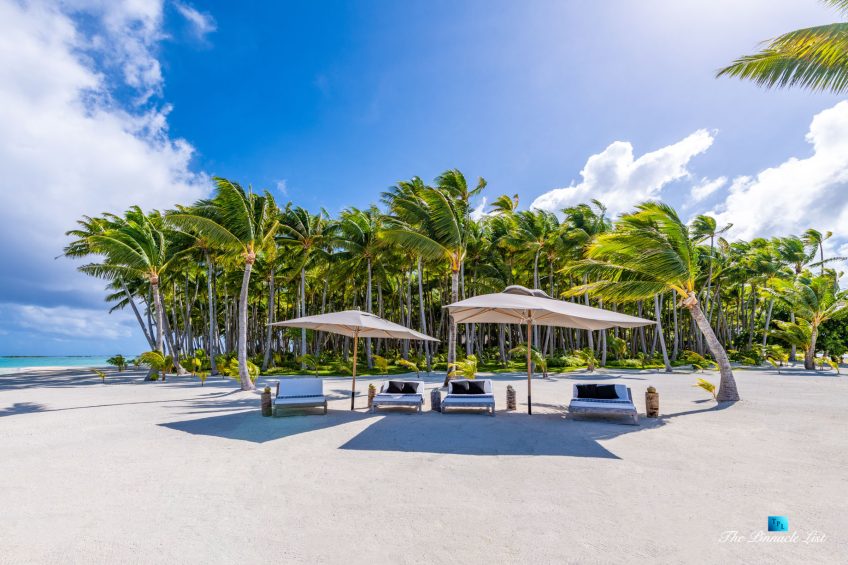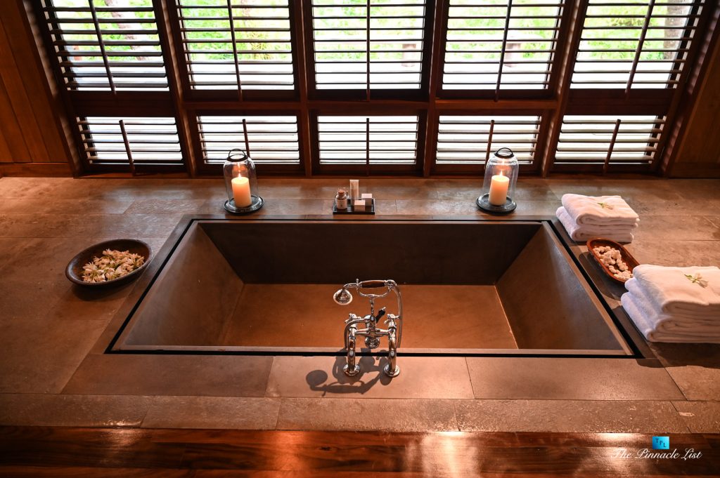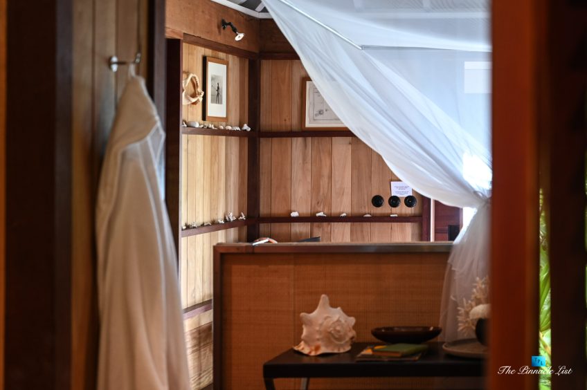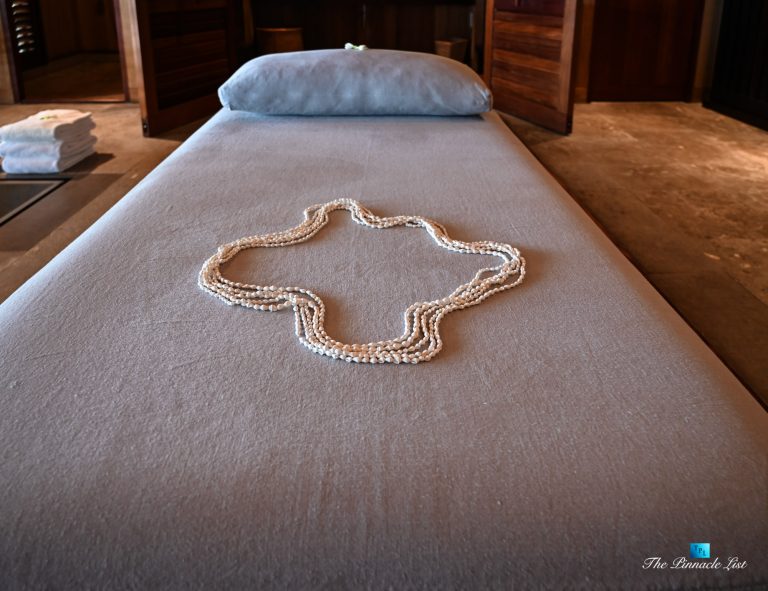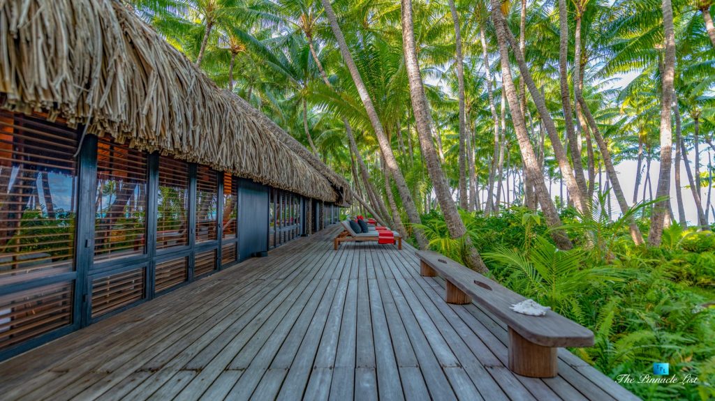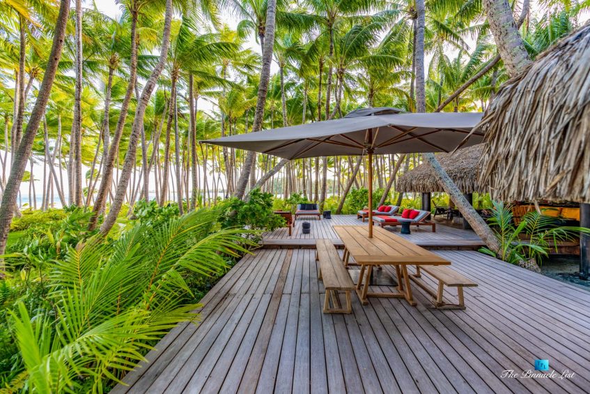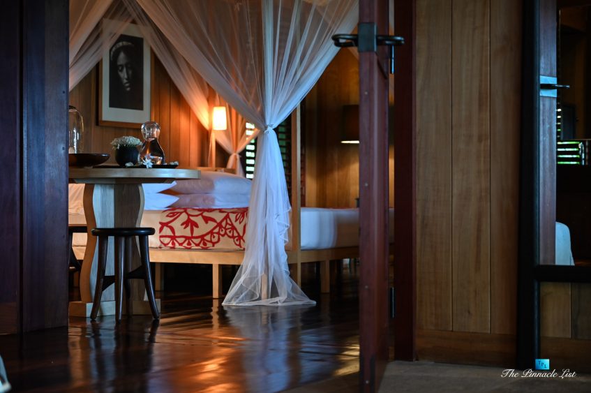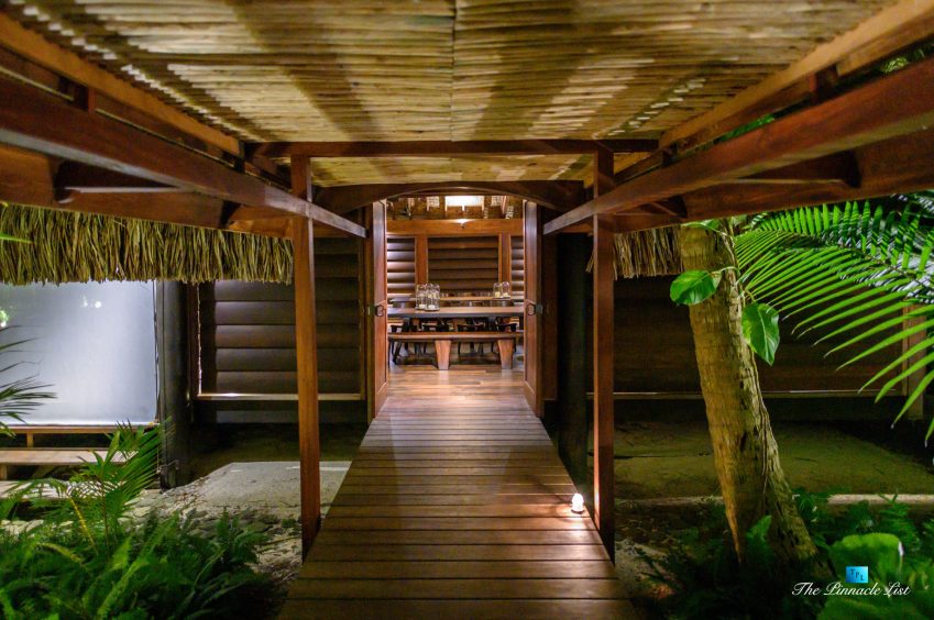 The grand room, an expansive space designed for both elegant gatherings and intimate soirées, is accompanied by a dining area equipped with a discreet wet bar and two large, custom-made tables capable of welcoming up to 36 guests in a setting of unparalleled grace and sophistication. Designed by the world-renowned Christian Liaigre, the interiors are a symphony of exclusive craftsmanship, with furniture custom-made from rare tropical woods and natural fabrics, enhancing the connection between luxury and the serenity of island life. Motorized screens in most bungalows offer the versatility to merge indoor opulence with the natural allure of the outdoors, providing a unique shelter against the elements when necessary.