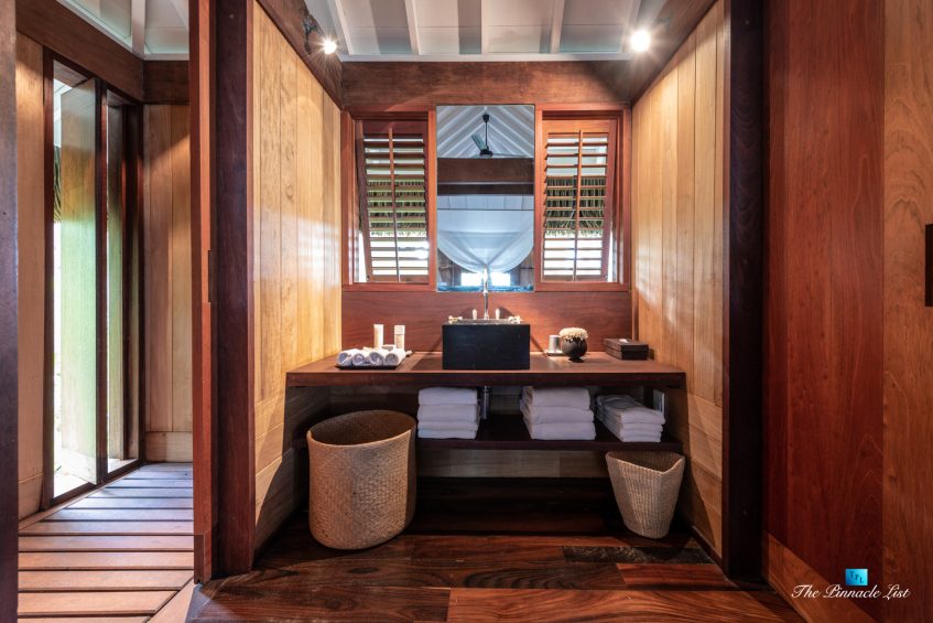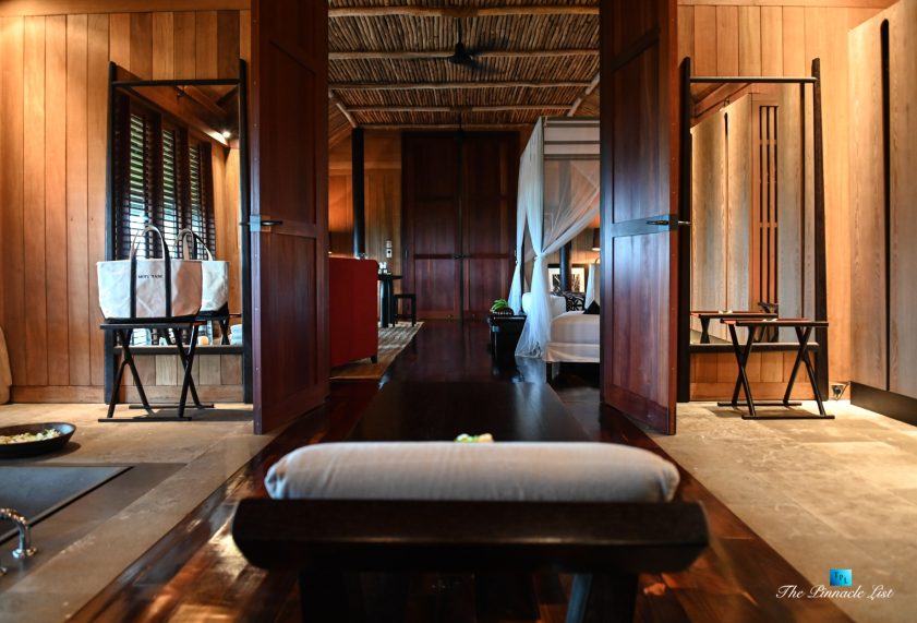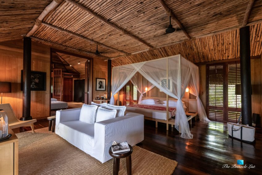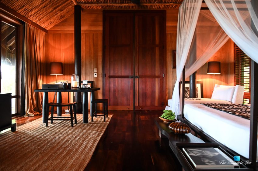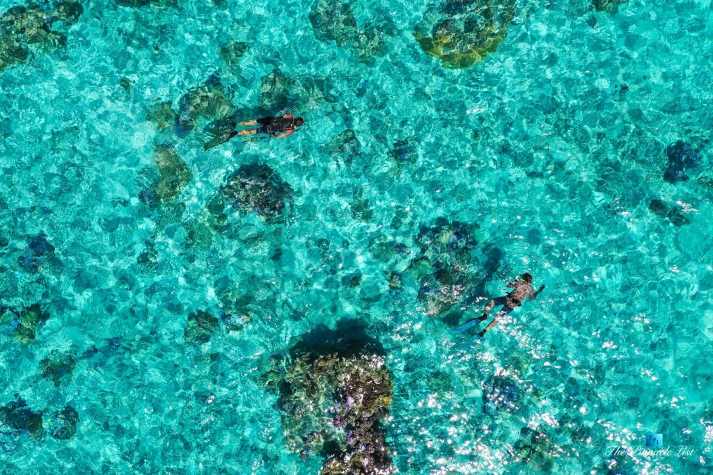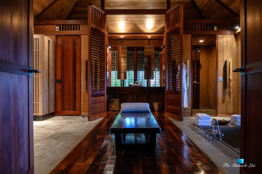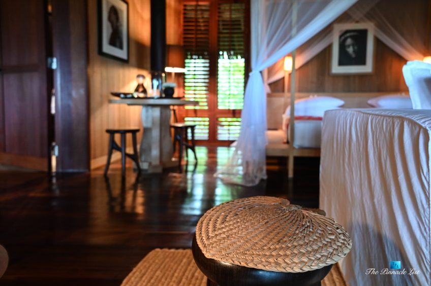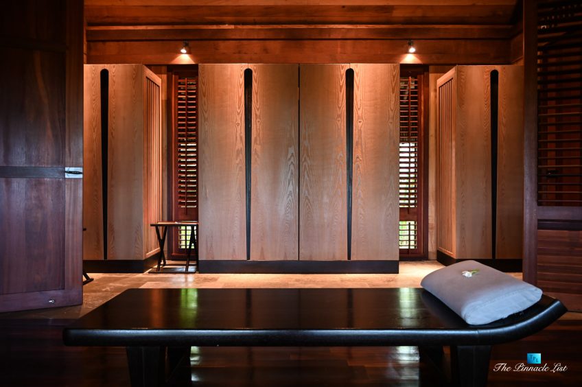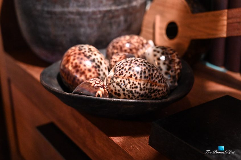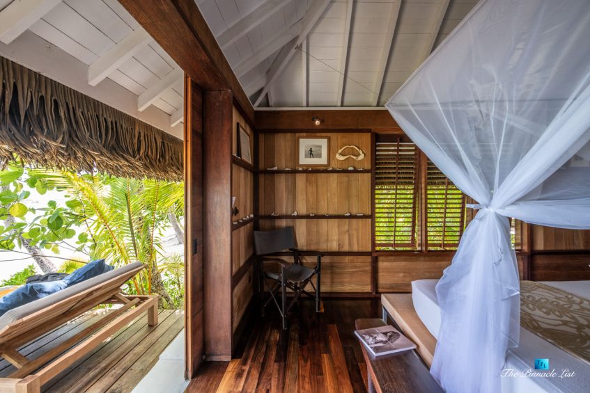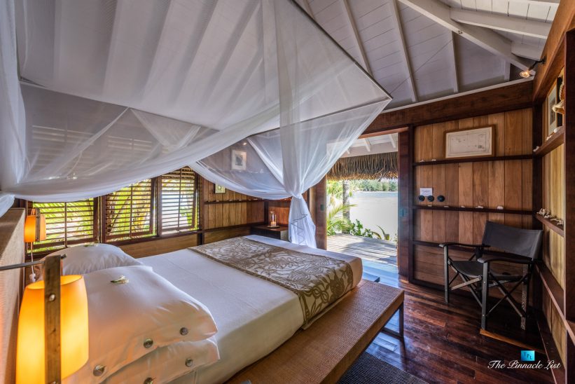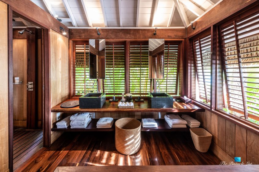 The grand room, an expansive space designed for both elegant gatherings and intimate soirées, is accompanied by a dining area equipped with a discreet wet bar and two large, custom-made tables capable of welcoming up to 36 guests in a setting of unparalleled grace and sophistication. Designed by the world-renowned Christian Liaigre, the interiors are a symphony of exclusive craftsmanship, with furniture custom-made from rare tropical woods and natural fabrics, enhancing the connection between luxury and the serenity of island life. Motorized screens in most bungalows offer the versatility to merge indoor opulence with the natural allure of the outdoors, providing a unique shelter against the elements when necessary.