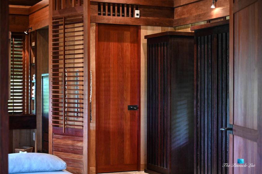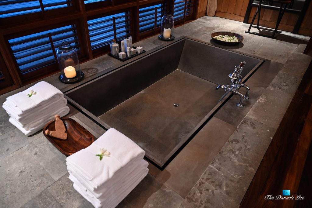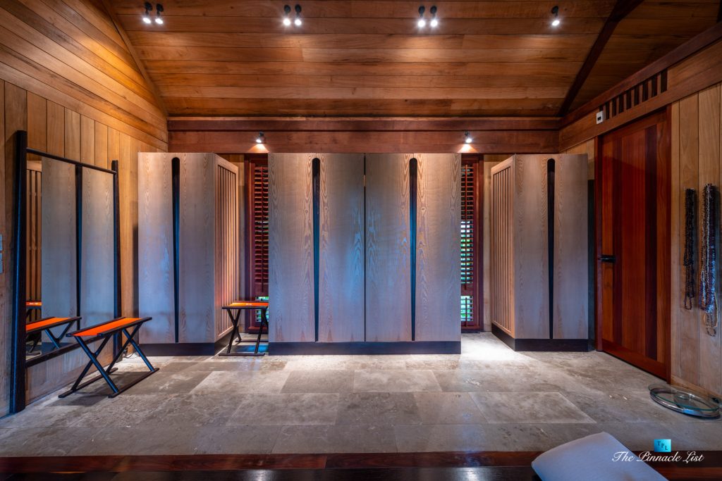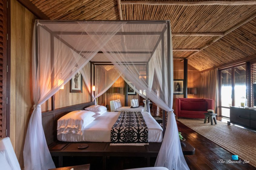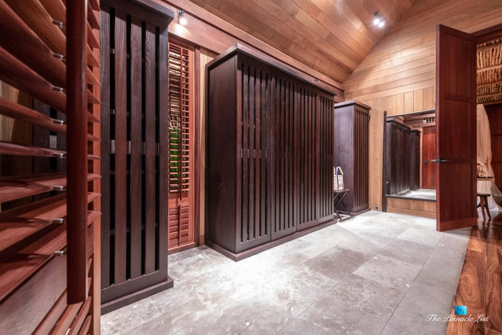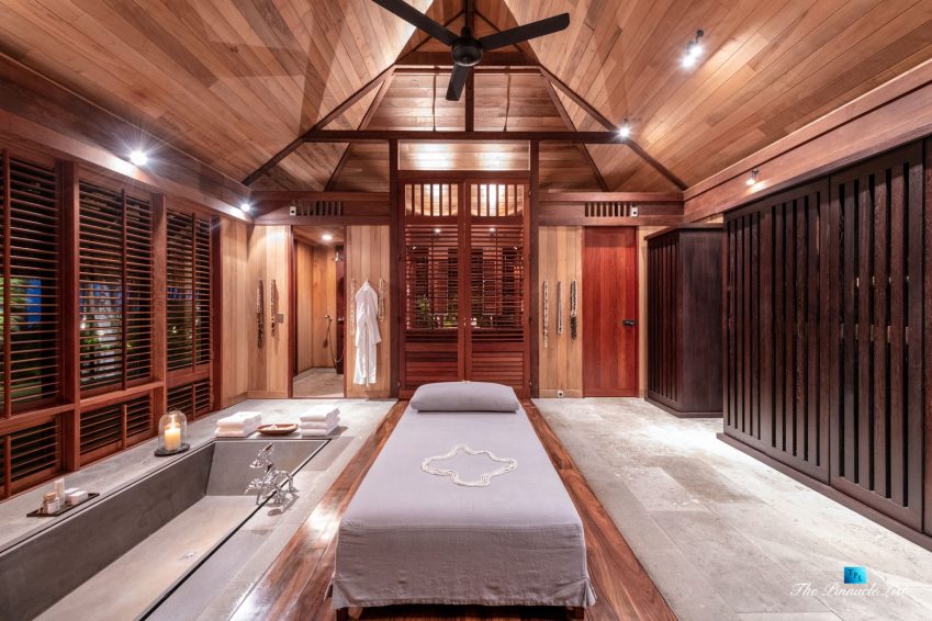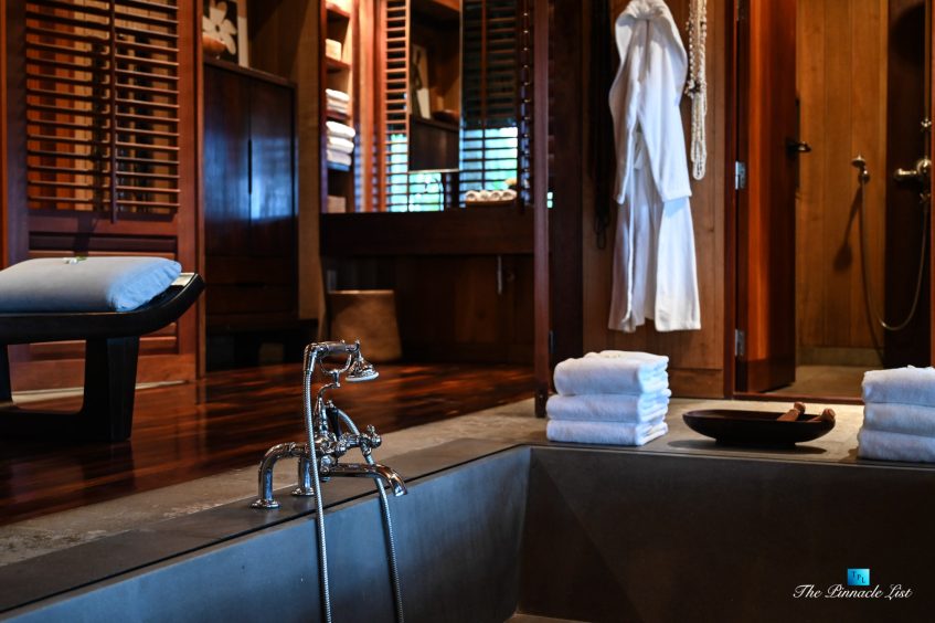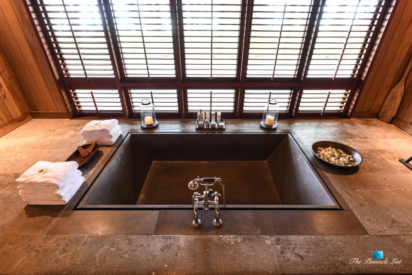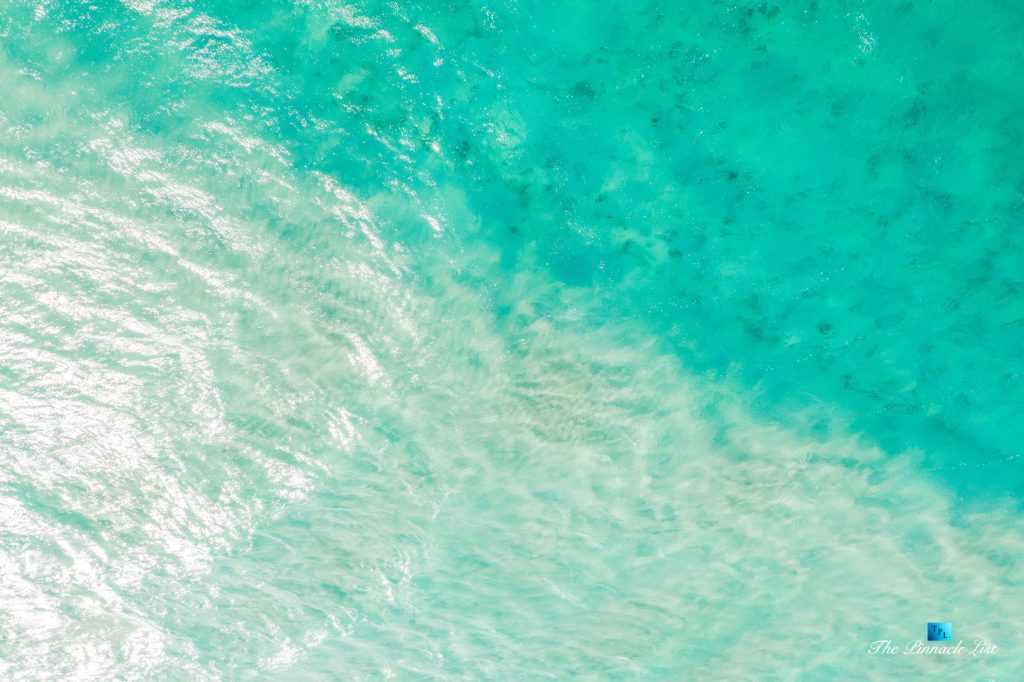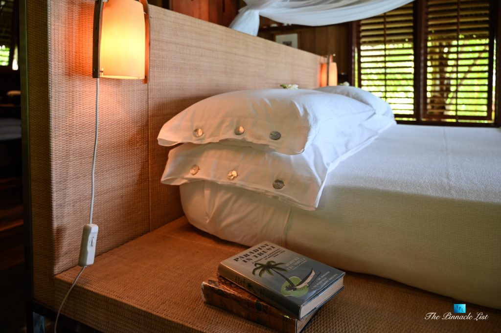 The grand room, an expansive space designed for both elegant gatherings and intimate soirées, is accompanied by a dining area equipped with a discreet wet bar and two large, custom-made tables capable of welcoming up to 36 guests in a setting of unparalleled grace and sophistication. Designed by the world-renowned Christian Liaigre, the interiors are a symphony of exclusive craftsmanship, with furniture custom-made from rare tropical woods and natural fabrics, enhancing the connection between luxury and the serenity of island life. Motorized screens in most bungalows offer the versatility to merge indoor opulence with the natural allure of the outdoors, providing a unique shelter against the elements when necessary.