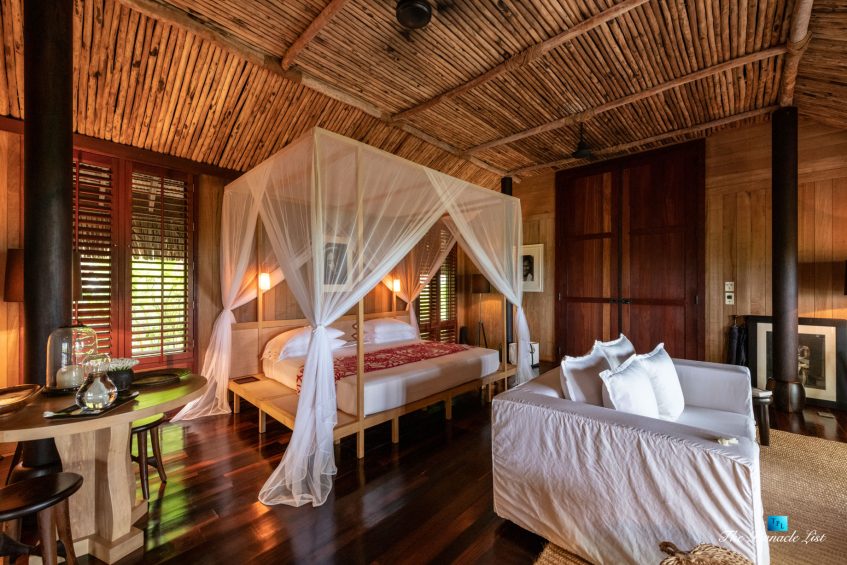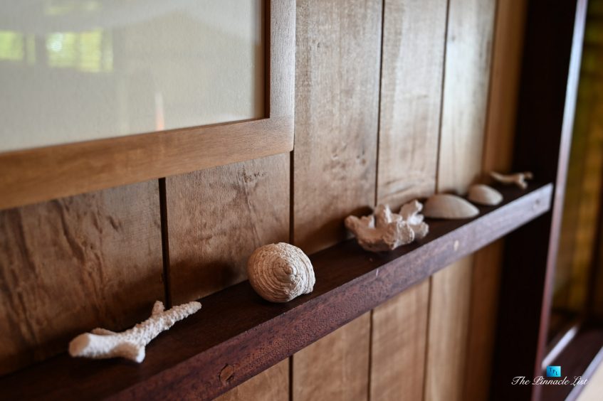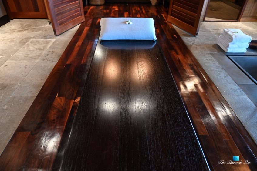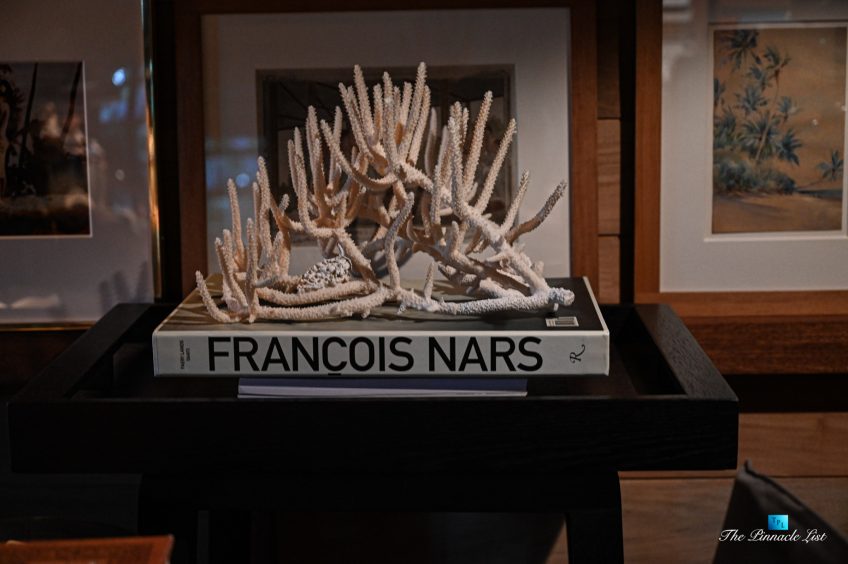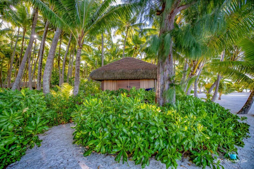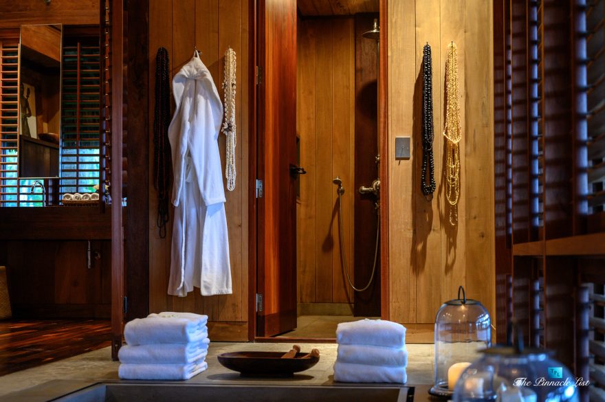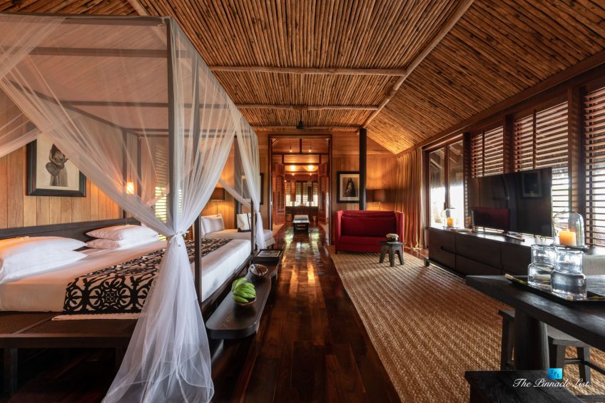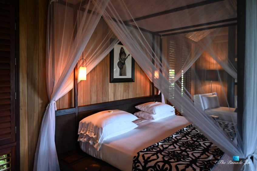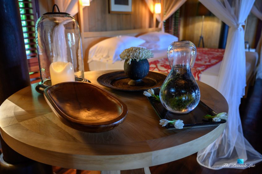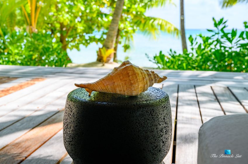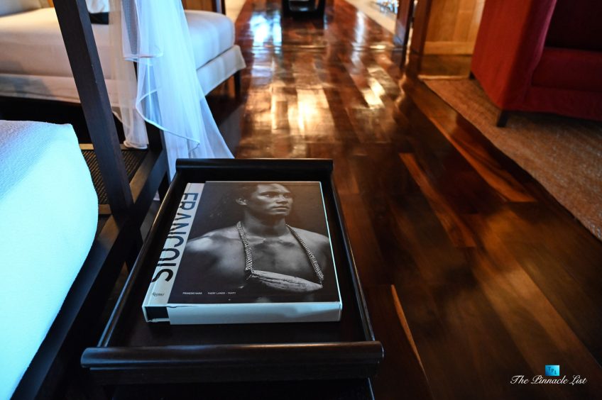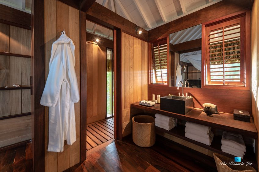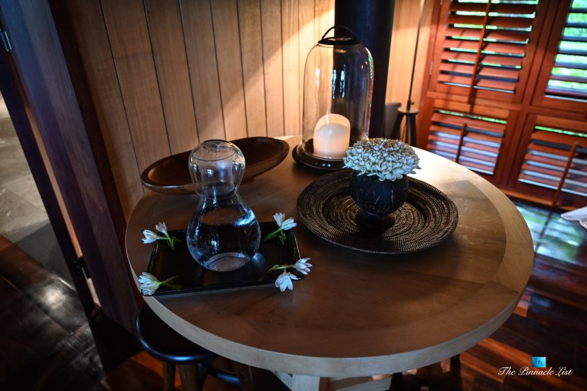 The grand room, an expansive space designed for both elegant gatherings and intimate soirées, is accompanied by a dining area equipped with a discreet wet bar and two large, custom-made tables capable of welcoming up to 36 guests in a setting of unparalleled grace and sophistication. Designed by the world-renowned Christian Liaigre, the interiors are a symphony of exclusive craftsmanship, with furniture custom-made from rare tropical woods and natural fabrics, enhancing the connection between luxury and the serenity of island life. Motorized screens in most bungalows offer the versatility to merge indoor opulence with the natural allure of the outdoors, providing a unique shelter against the elements when necessary.