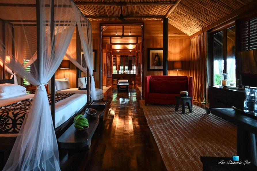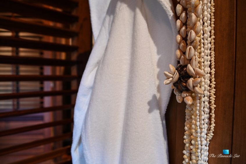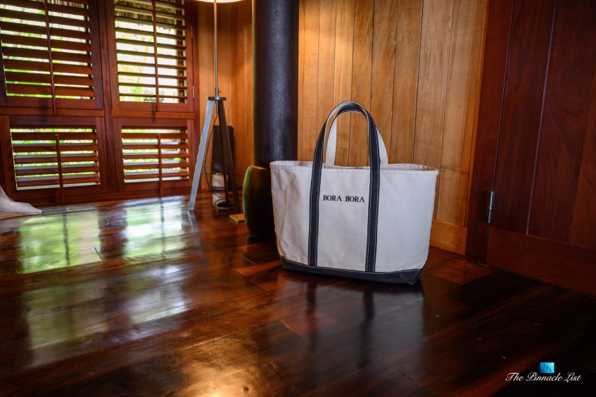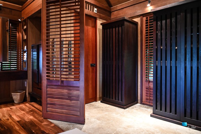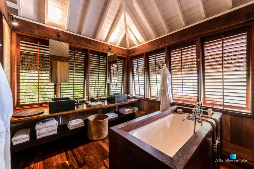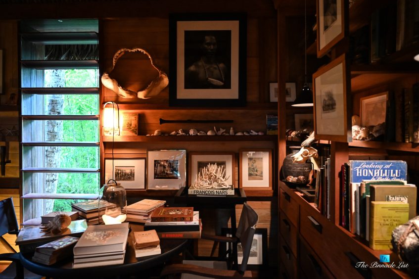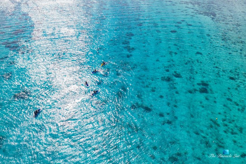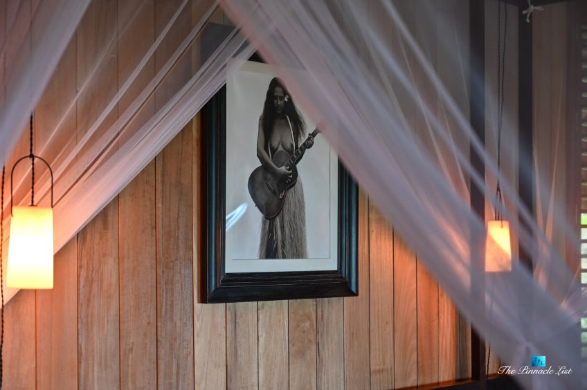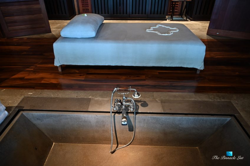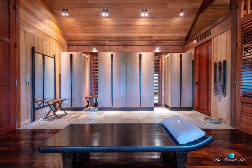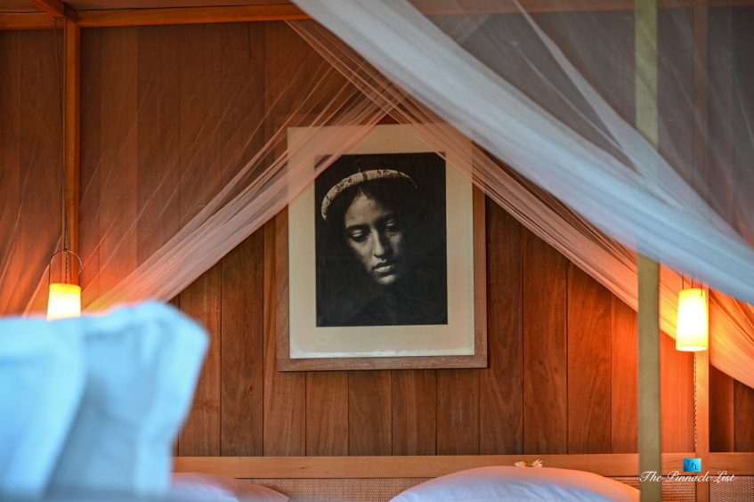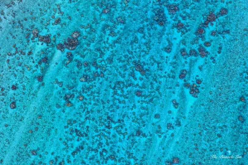 The grand room, an expansive space designed for both elegant gatherings and intimate soirées, is accompanied by a dining area equipped with a discreet wet bar and two large, custom-made tables capable of welcoming up to 36 guests in a setting of unparalleled grace and sophistication. Designed by the world-renowned Christian Liaigre, the interiors are a symphony of exclusive craftsmanship, with furniture custom-made from rare tropical woods and natural fabrics, enhancing the connection between luxury and the serenity of island life. Motorized screens in most bungalows offer the versatility to merge indoor opulence with the natural allure of the outdoors, providing a unique shelter against the elements when necessary.