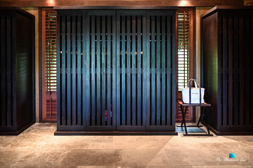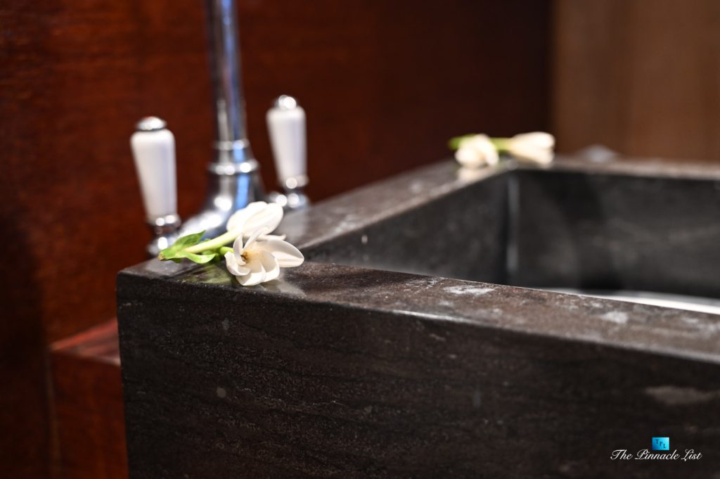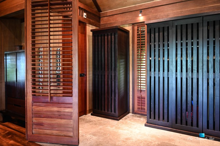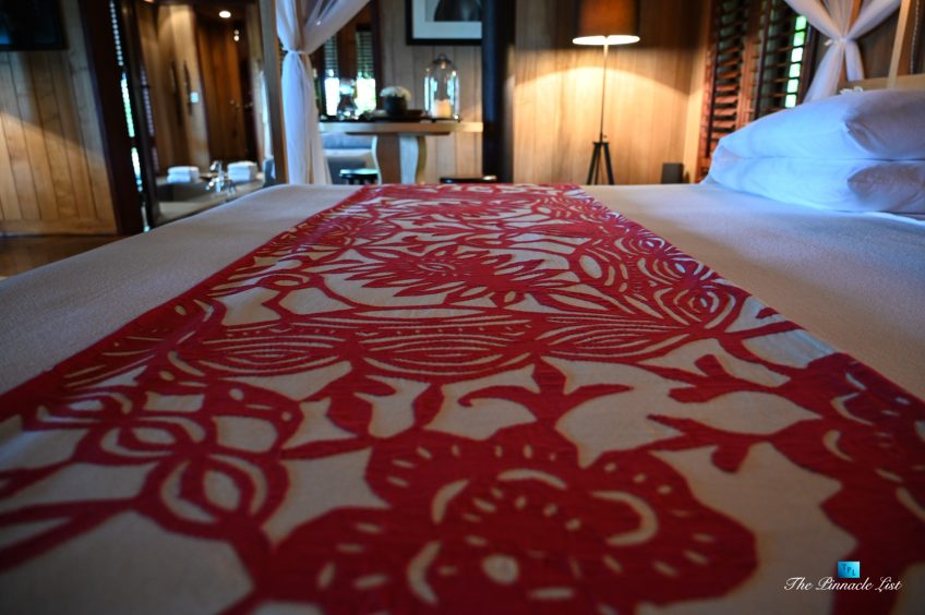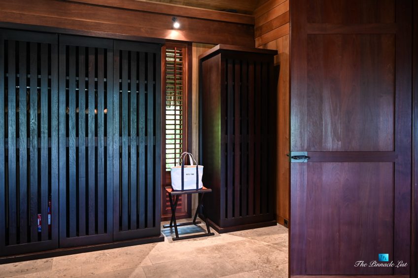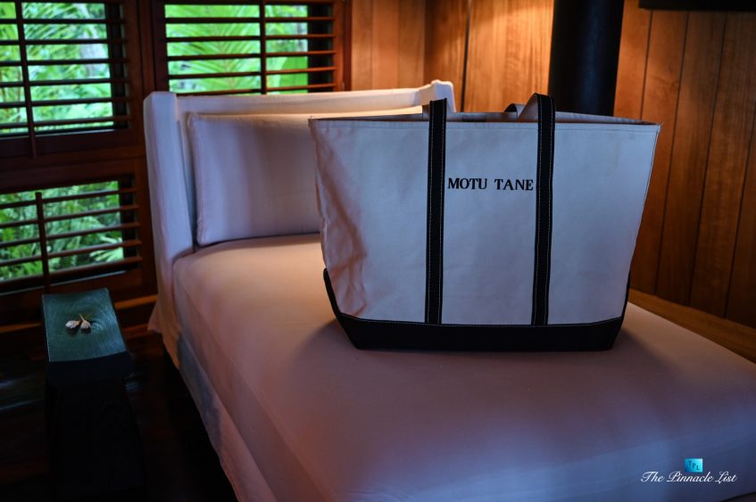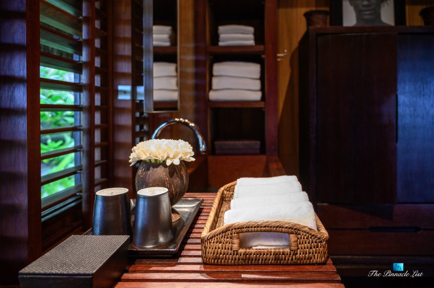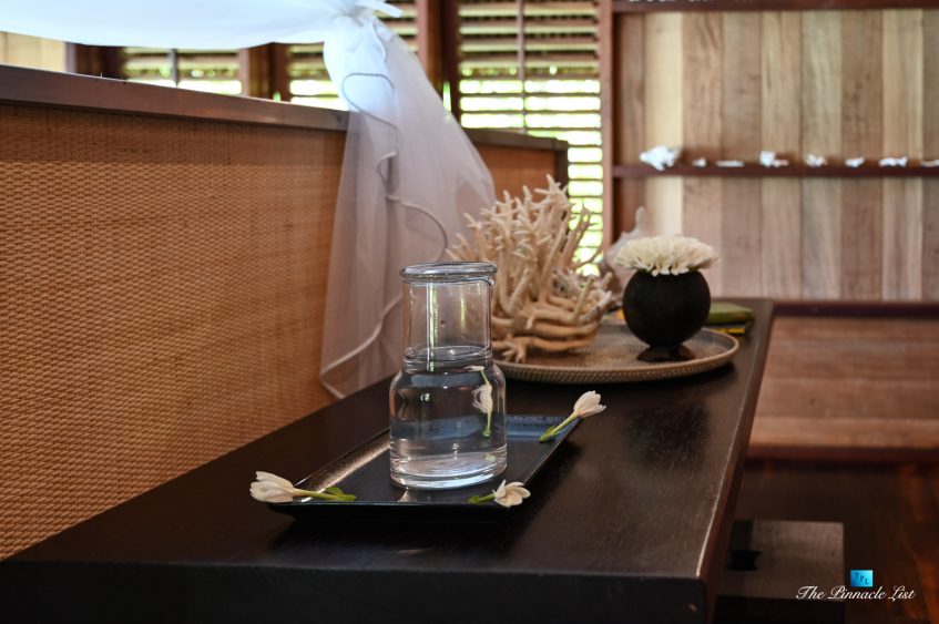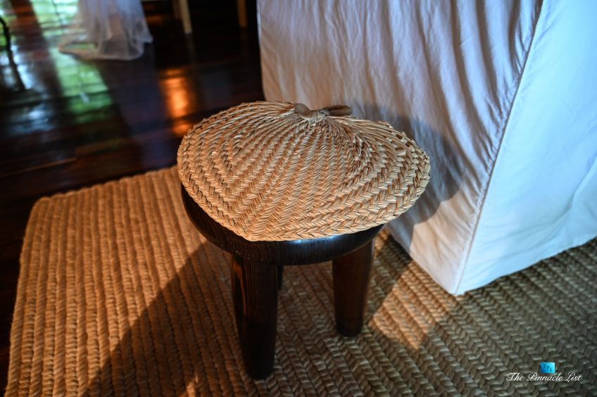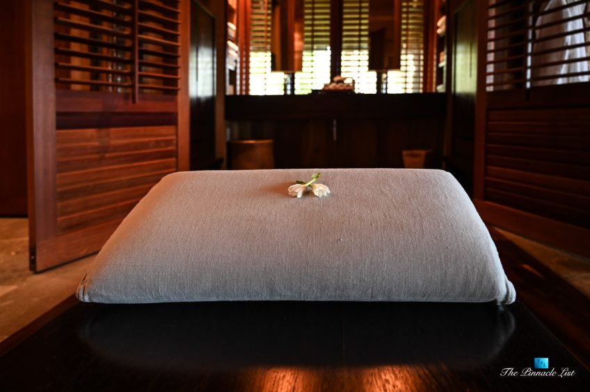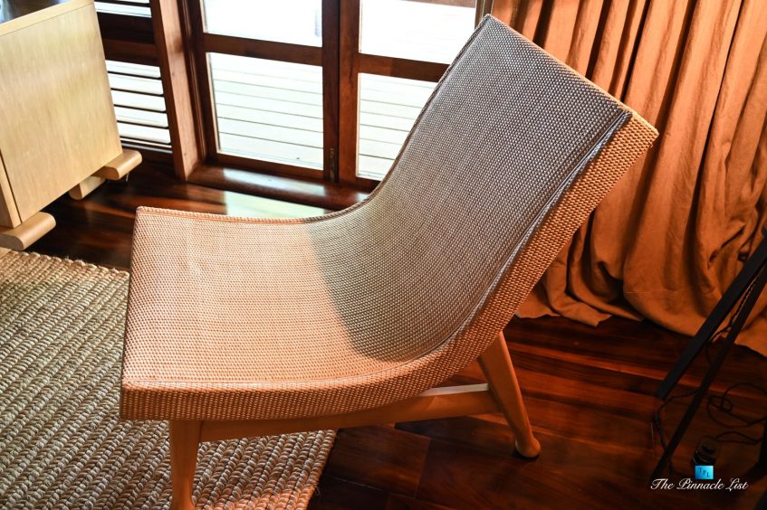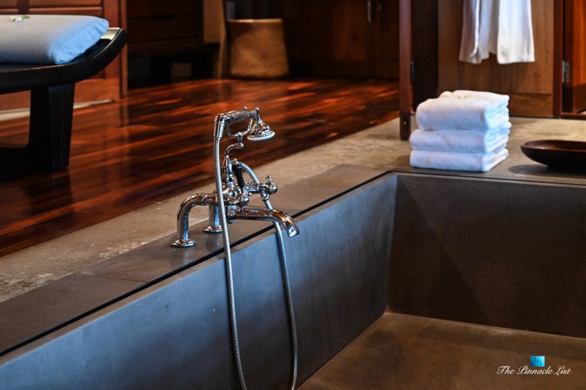 The grand room, an expansive space designed for both elegant gatherings and intimate soirées, is accompanied by a dining area equipped with a discreet wet bar and two large, custom-made tables capable of welcoming up to 36 guests in a setting of unparalleled grace and sophistication. Designed by the world-renowned Christian Liaigre, the interiors are a symphony of exclusive craftsmanship, with furniture custom-made from rare tropical woods and natural fabrics, enhancing the connection between luxury and the serenity of island life. Motorized screens in most bungalows offer the versatility to merge indoor opulence with the natural allure of the outdoors, providing a unique shelter against the elements when necessary.