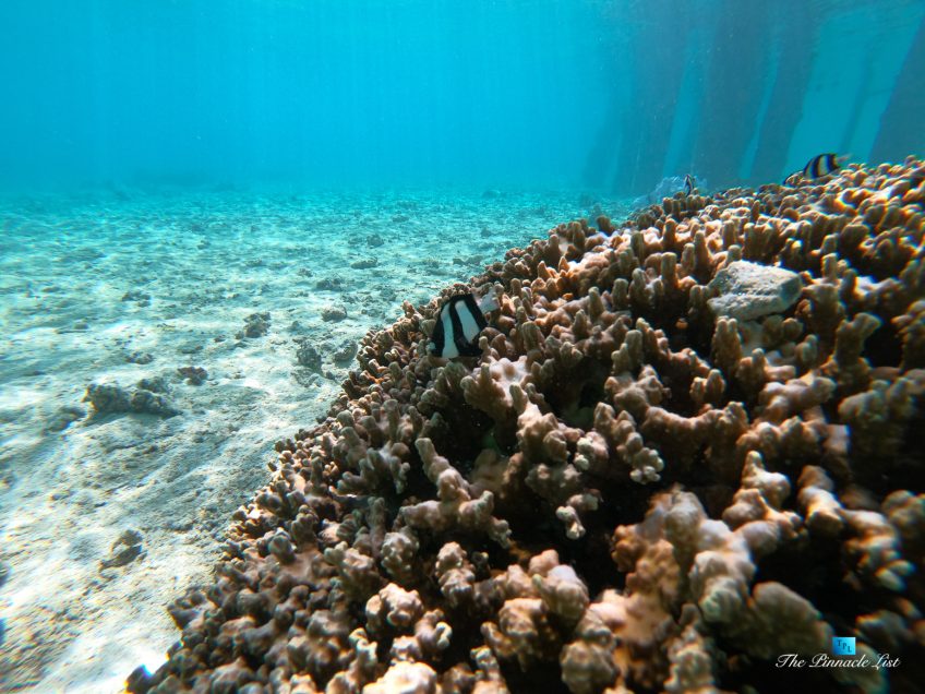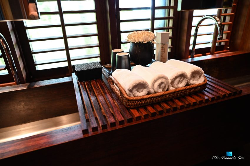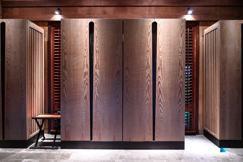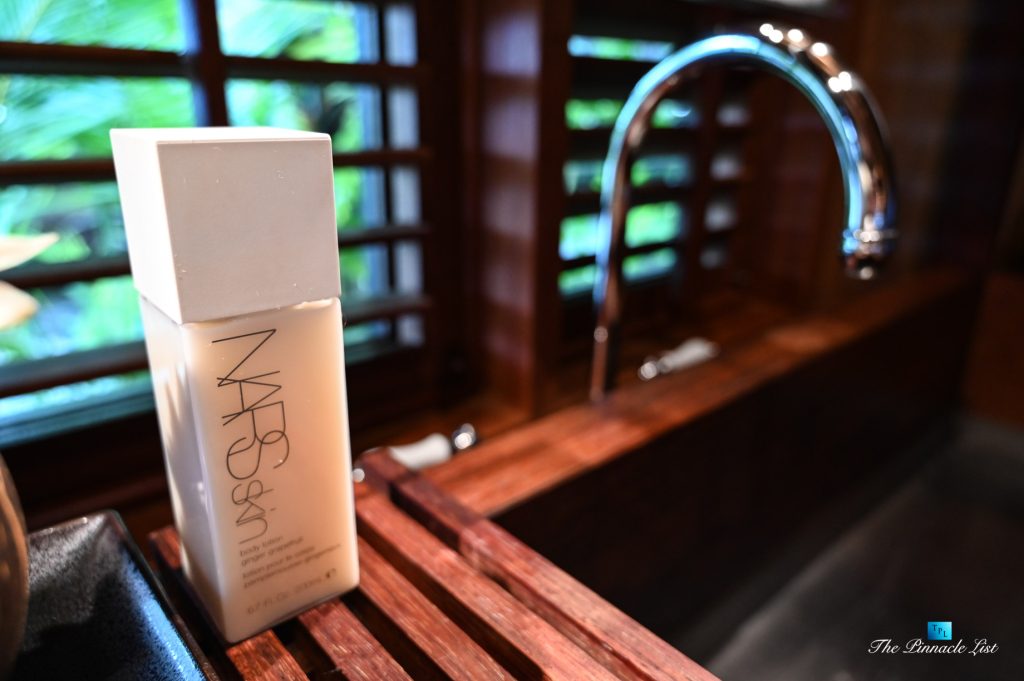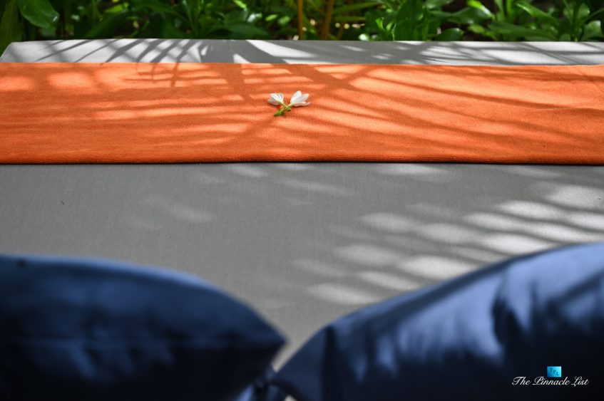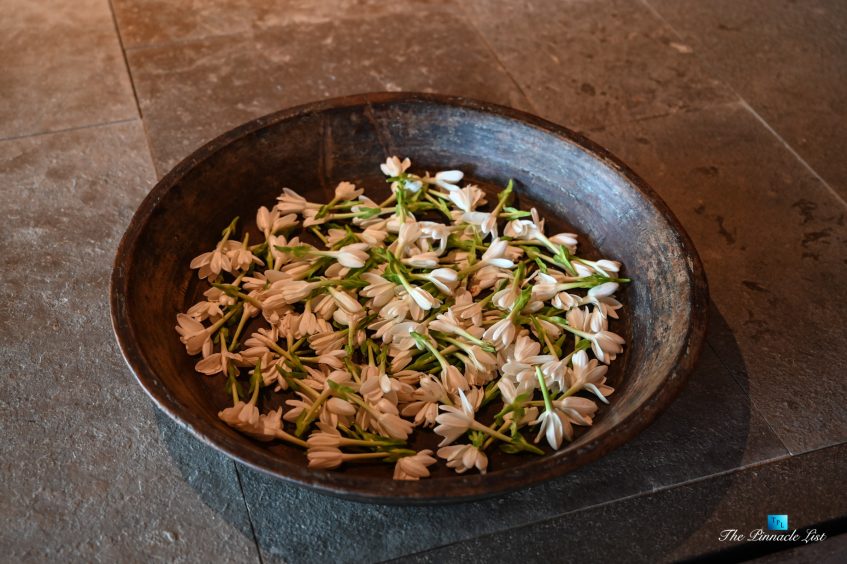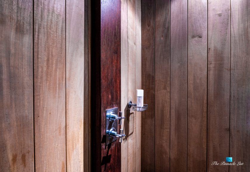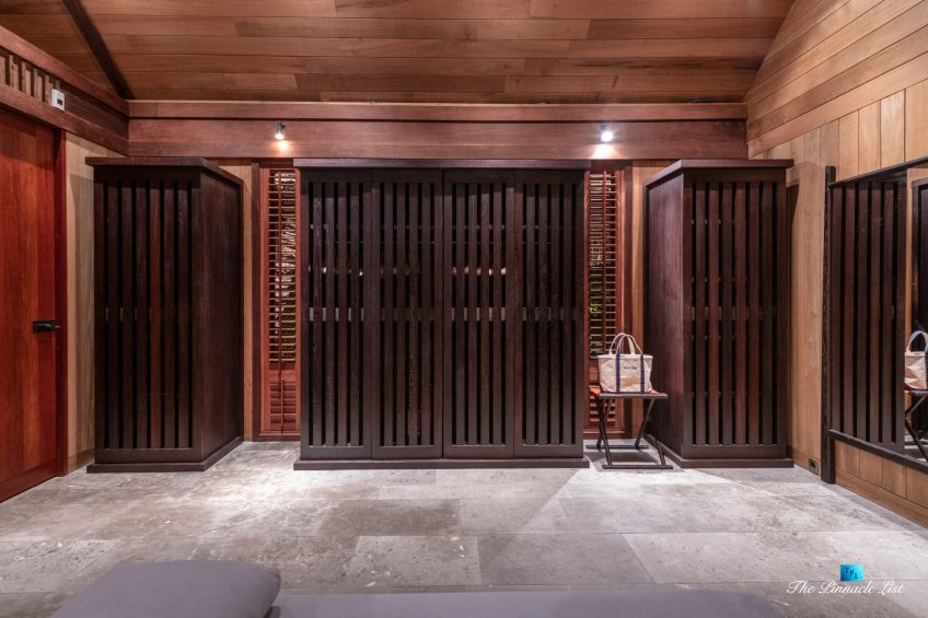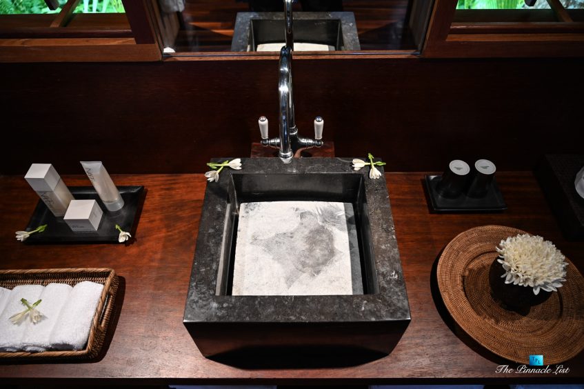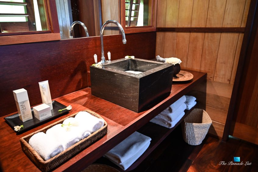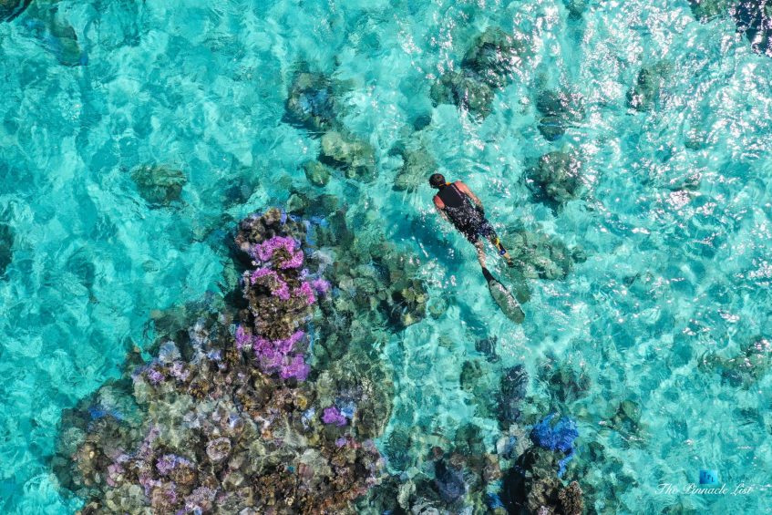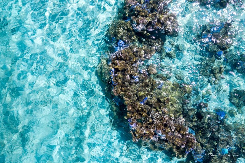 The grand room, an expansive space designed for both elegant gatherings and intimate soirées, is accompanied by a dining area equipped with a discreet wet bar and two large, custom-made tables capable of welcoming up to 36 guests in a setting of unparalleled grace and sophistication. Designed by the world-renowned Christian Liaigre, the interiors are a symphony of exclusive craftsmanship, with furniture custom-made from rare tropical woods and natural fabrics, enhancing the connection between luxury and the serenity of island life. Motorized screens in most bungalows offer the versatility to merge indoor opulence with the natural allure of the outdoors, providing a unique shelter against the elements when necessary.