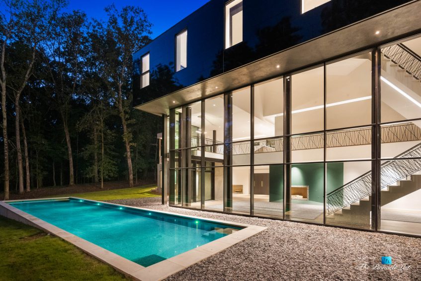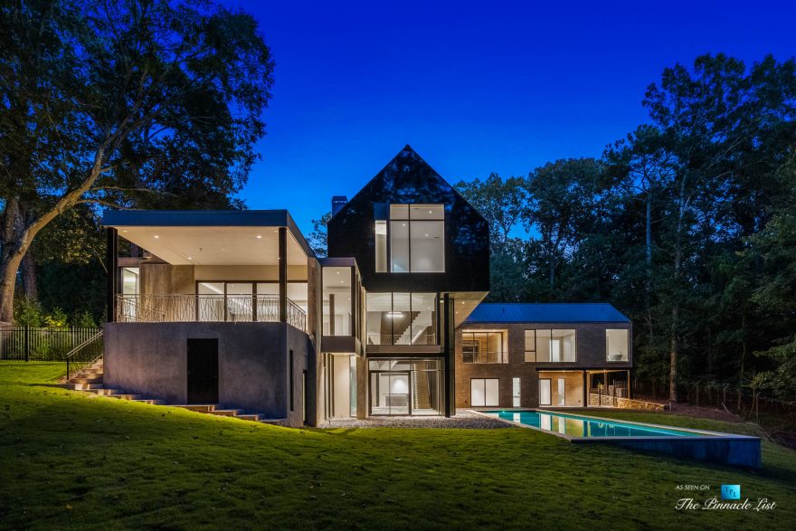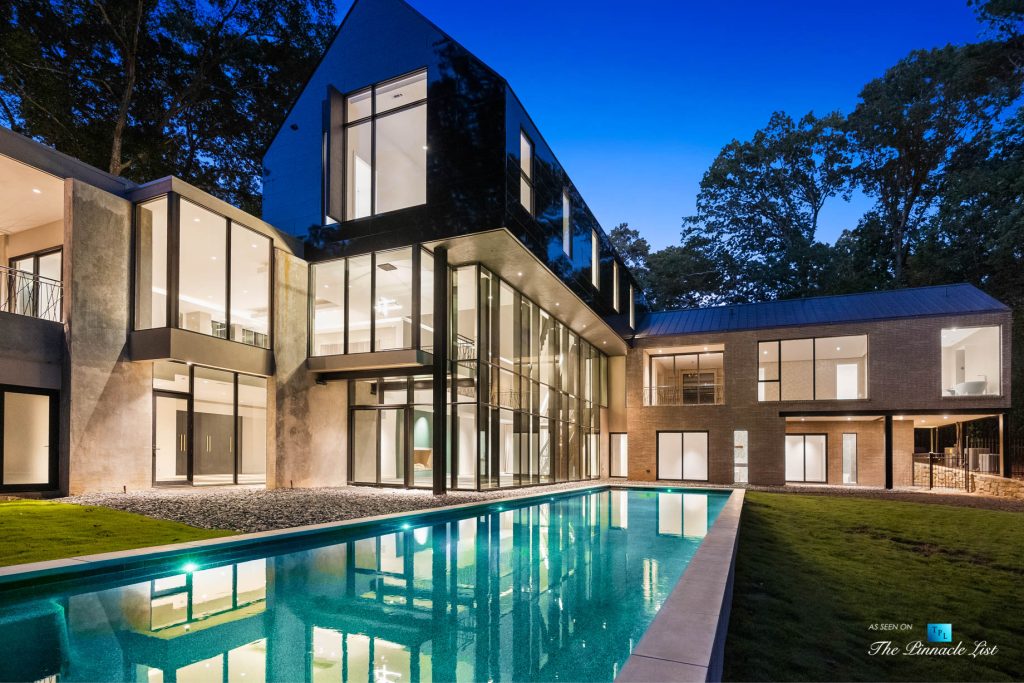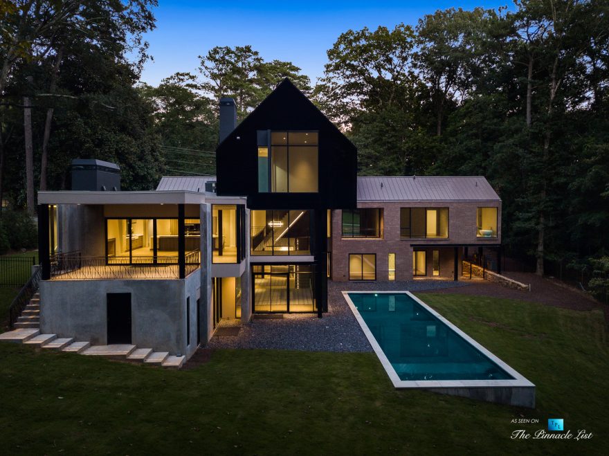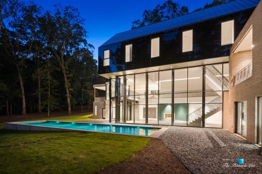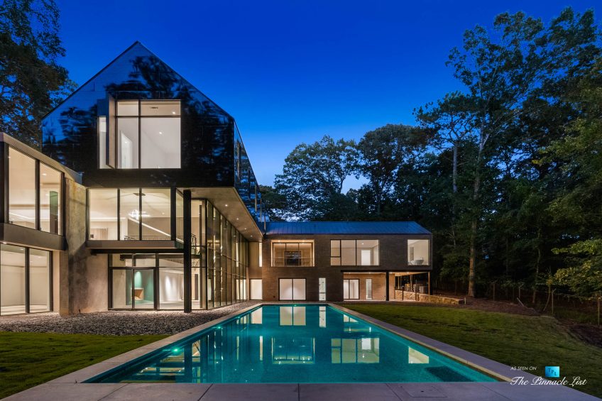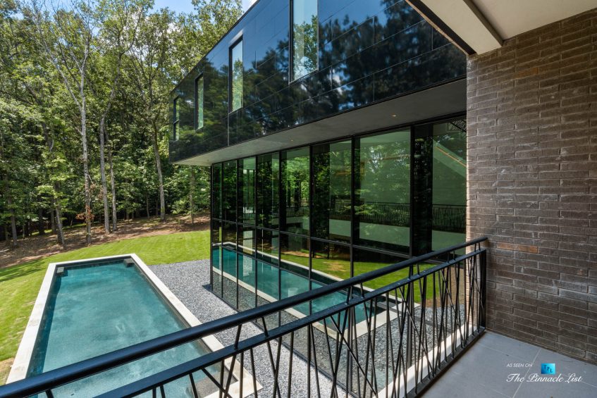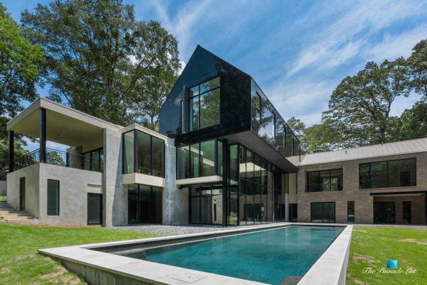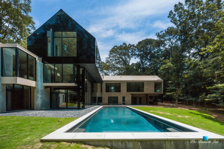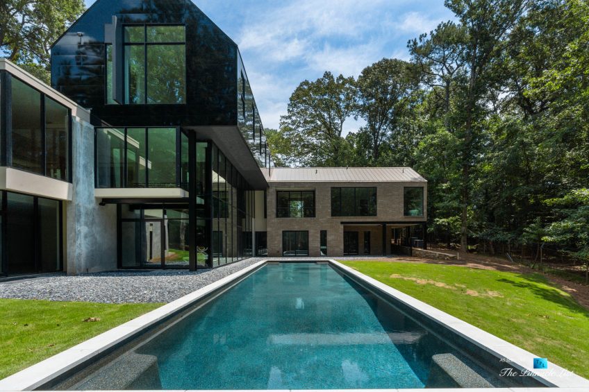 This New Construction smart home modern residence is designed to maximize the incredible views of the property and is perfectly sited around a 65 foot pool on a private, flat 1.1 acre lot in Buckhead. Inside as the sun reflects off of the pool, reflections of light move across the ceiling throughout the day through the 3 story glass curtain wall by Reynaers (Belgium) by Expert Window and door. The kitchen, designed by Design Galleria is exceptional with Temmer marble counters and a hidden walk in pantry. Steam Wolf oven and Sub Zero complement the custom cabinetry. The main entrance and lower doors are pivoting by La Cantina. Exterior brick is Meridian brick and the black reflective wall panels, the first in the US are Nichiha Miraia panels by Legendary Exteriors. The plumbing fixtures are by Porcelanosa and Dornbracht. The finish level is excellent and a collaboration with Harrison Design Architects. The main living room space has a full bar, game room with fireplace, 2 bedrooms/bathrooms that open out to the pool. The master bedroom suite is on the main level with study and separate dressing rooms. The upstairs features 2 bedrooms/baths and an additional laundry room. This home is energy efficient and completely wired for whole house automation. Elevator shaft and 3 car garage near the kitchen.