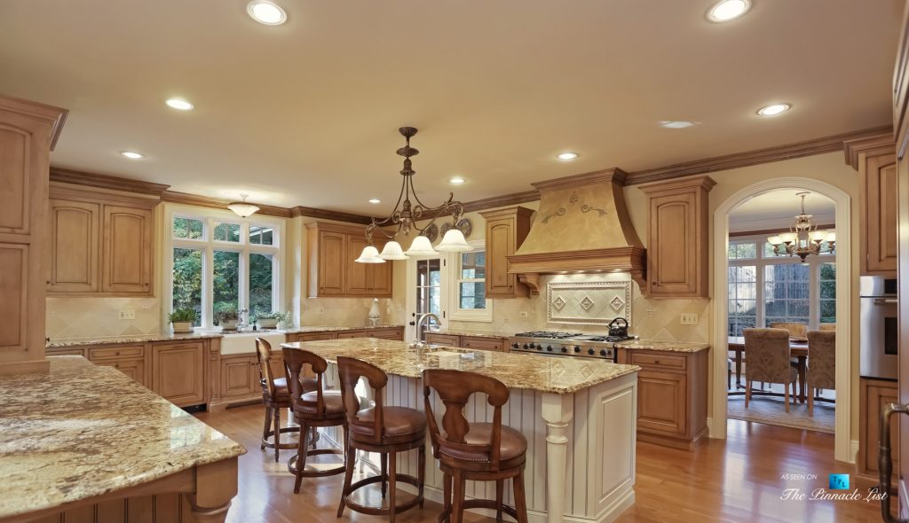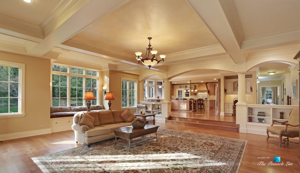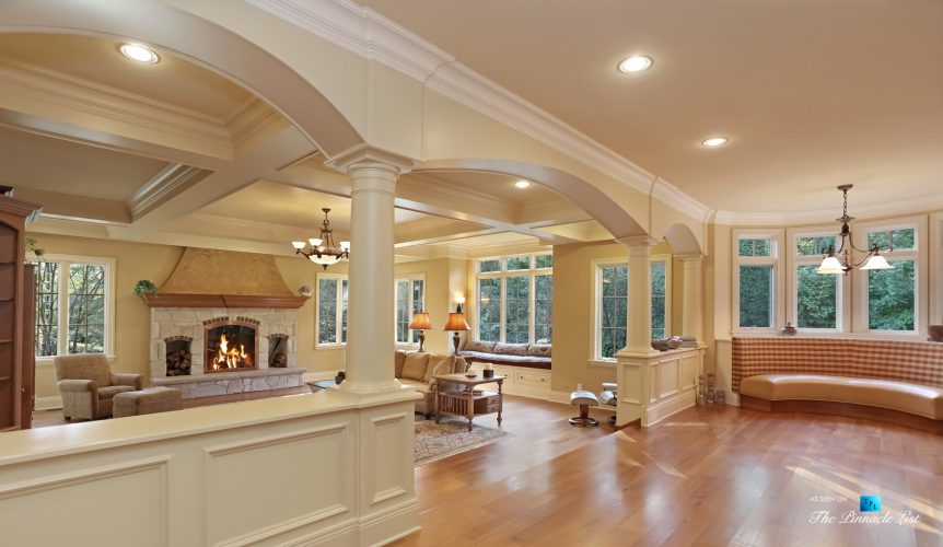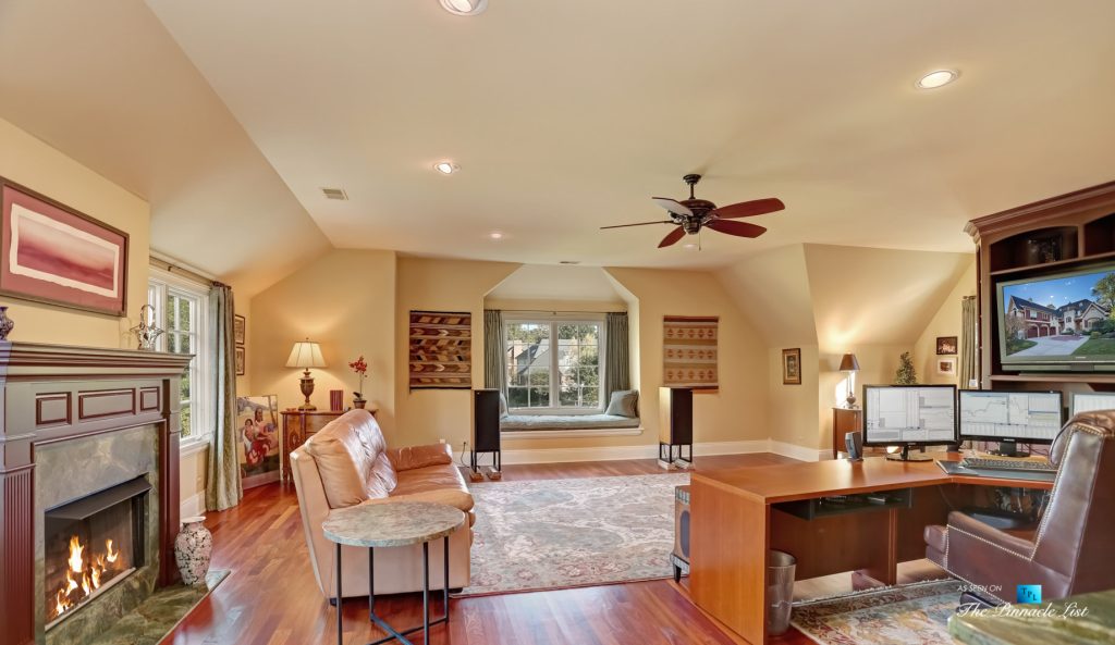 Masterfully detailed custom home sits at the end of a quiet cul-de-sac, across from large private field, on professionally landscaped lot sprinkled with beautiful/mature trees. Open floor plan, luxurious details and comfortable elegance ideal for entertaining. The gourmet kitchen features high-end appliances including a Viking 6 burner stove, custom maple cabinetry and white oak floors. The large eat-in area has built- in bay window seating. Beautiful crown moulding, millwork and stone finishes throughout. Bevelled glass pocket doors separate the formal living room and huge formal dining room. Spacious screened and windowed porch with wood burning fireplace is adjacent to kitchen and dining room. Included in the 5,800 sq. ft. is a total of 5 bedrooms and 4.5 bathrooms. Second floor also features a laundry room and oversized executive office, complete with fireplace, custom built-ins and lots of natural light. Office also has staircase that leads to the 3 car garage.3rd level could be 5th bedroom or playroom. Finished 2,200 sq. ft. lower level features kitchen and home theater.